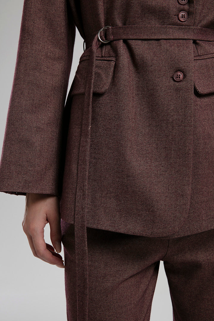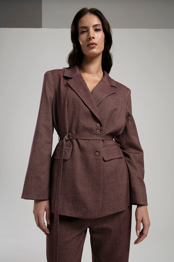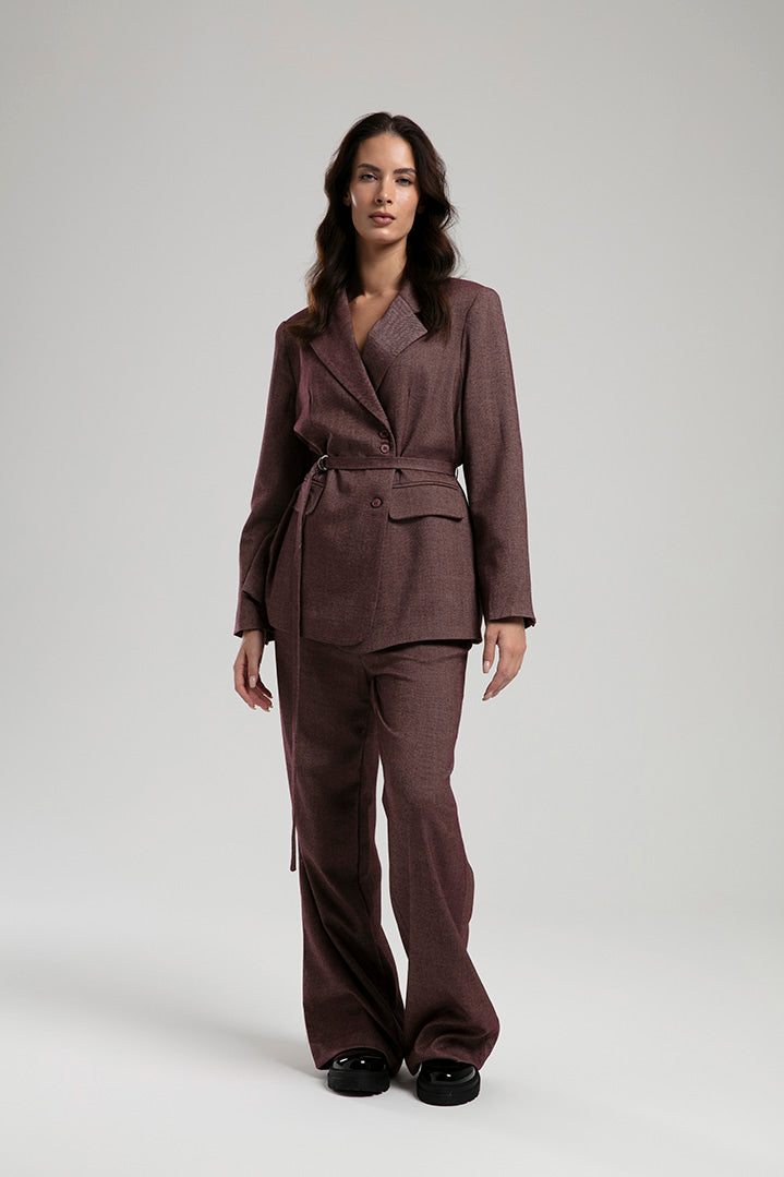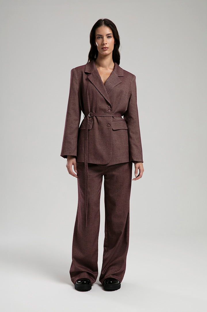 A tailored two-piece set, featuring a belted blazer and wide-leg trousers. The blazer is designed with structured lapels, flap pockets, and a detachable belt for a cinched waist, while the coordinating trousers offer a fluid drape with a relaxed fit. Together, the set creates a sophisticated, modern silhouette — perfect for both office wear and elevated evening styling.