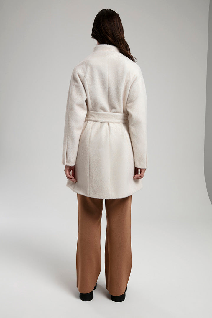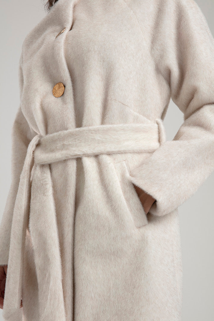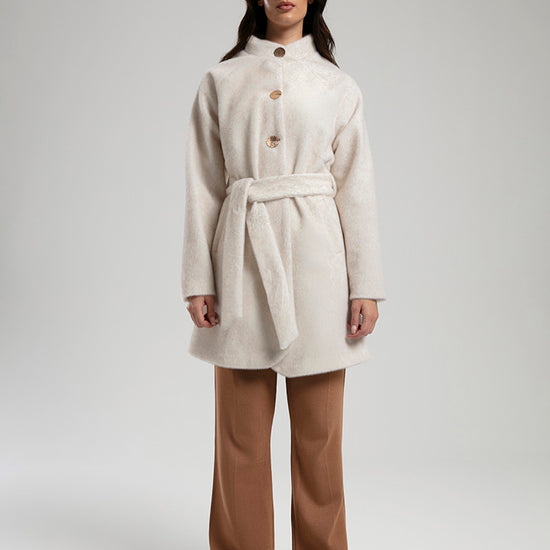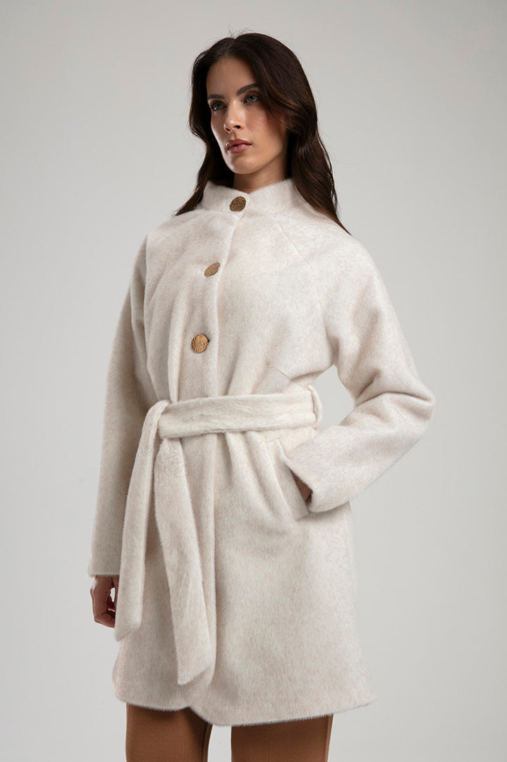 An elegant coat crafted from a soft textured fabric, detailed with gold-tone buttons and a tie belt to define the waist. The high neckline and clean silhouette make it a chic choice for both everyday wear and refined outings, balancing comfort with sophisticated style.