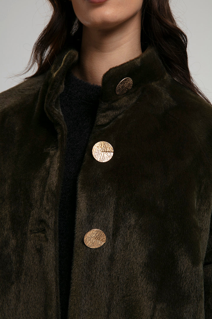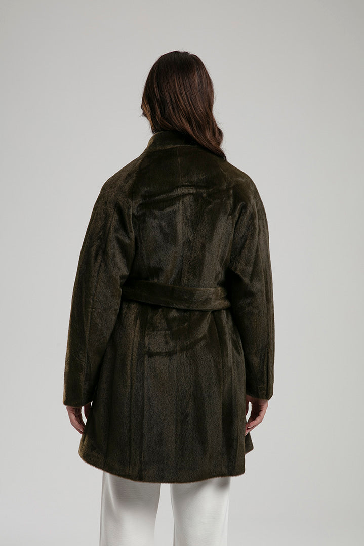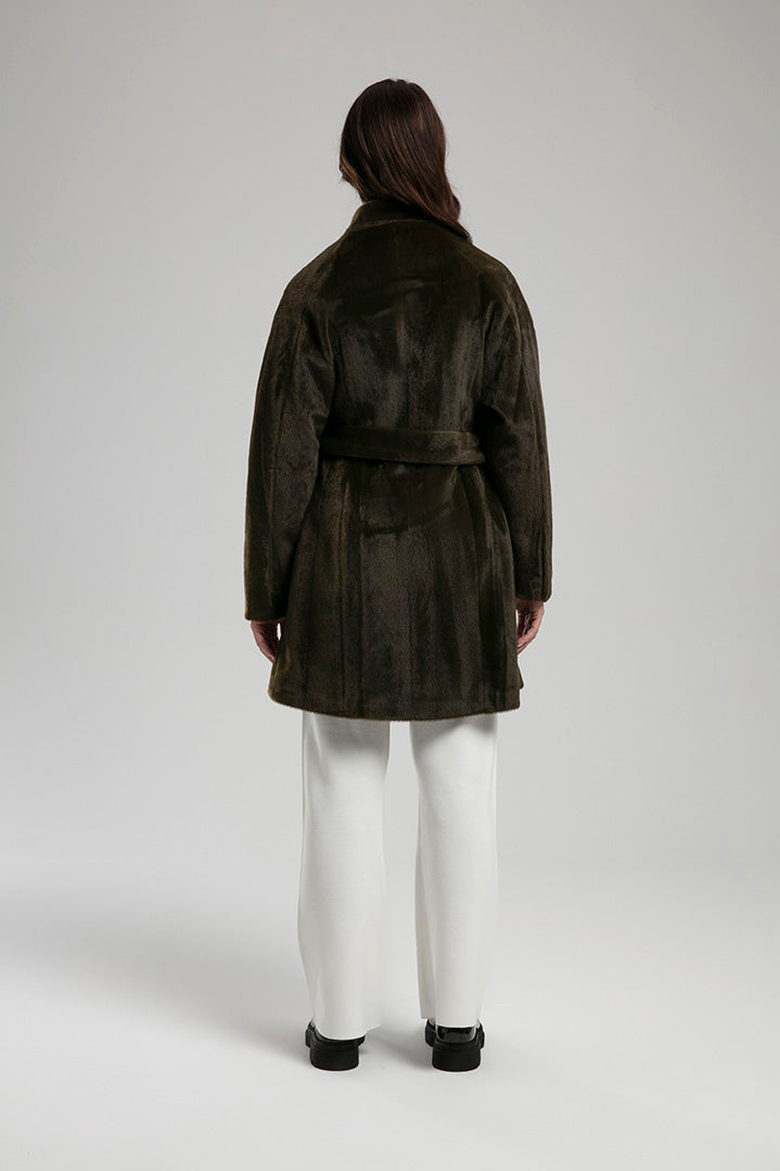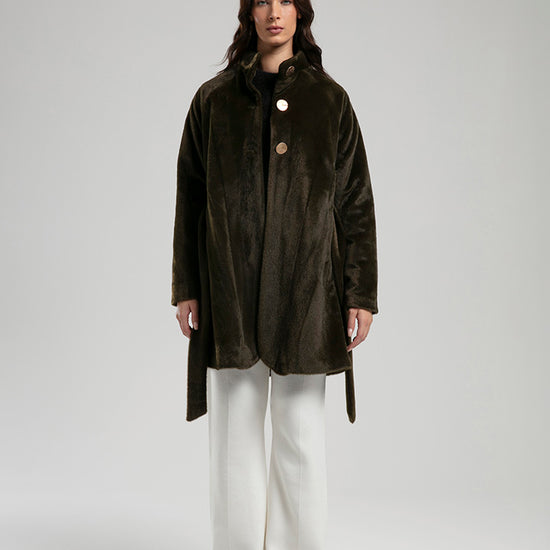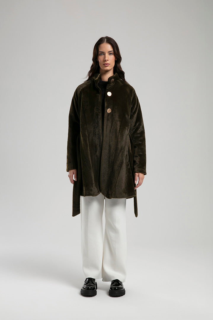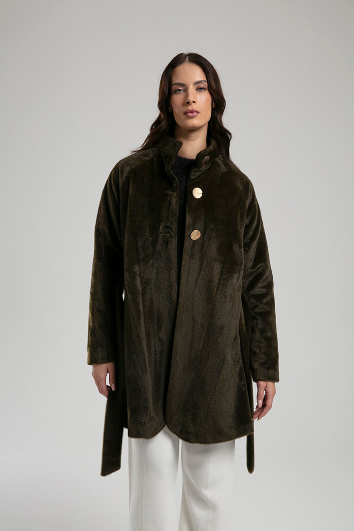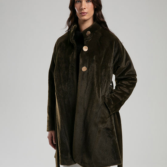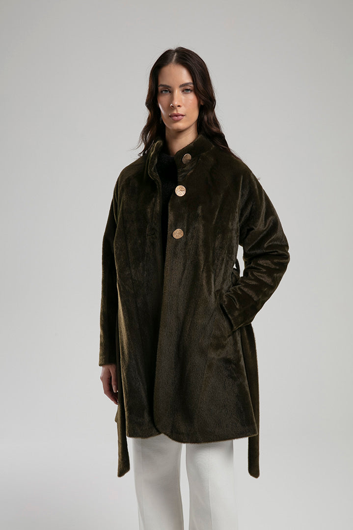 An elegant coat crafted from a soft textured fabric, detailed with gold-tone buttons and a tie belt to define the waist. The high neckline and clean silhouette make it a chic choice for both everyday wear and refined outings, balancing comfort with sophisticated style.