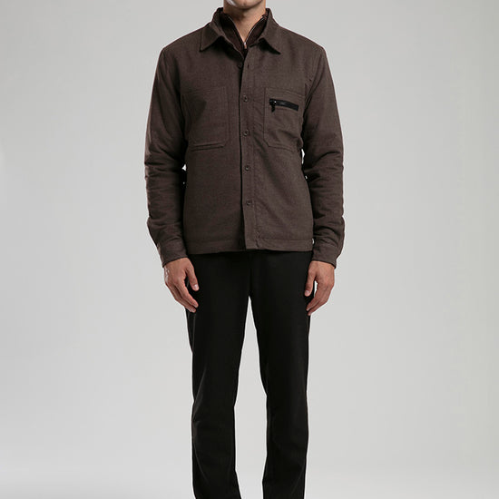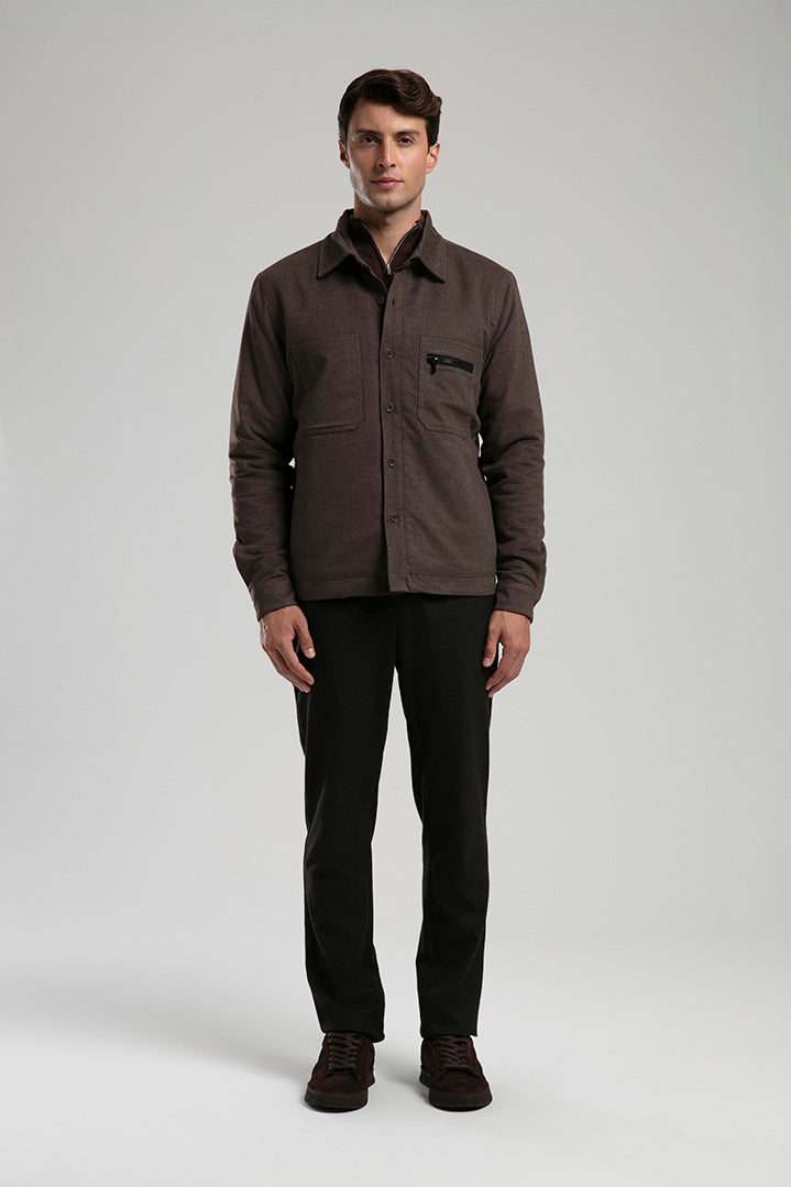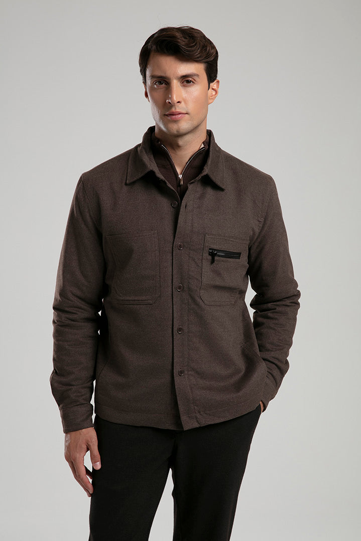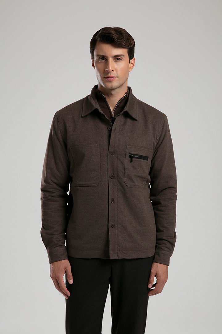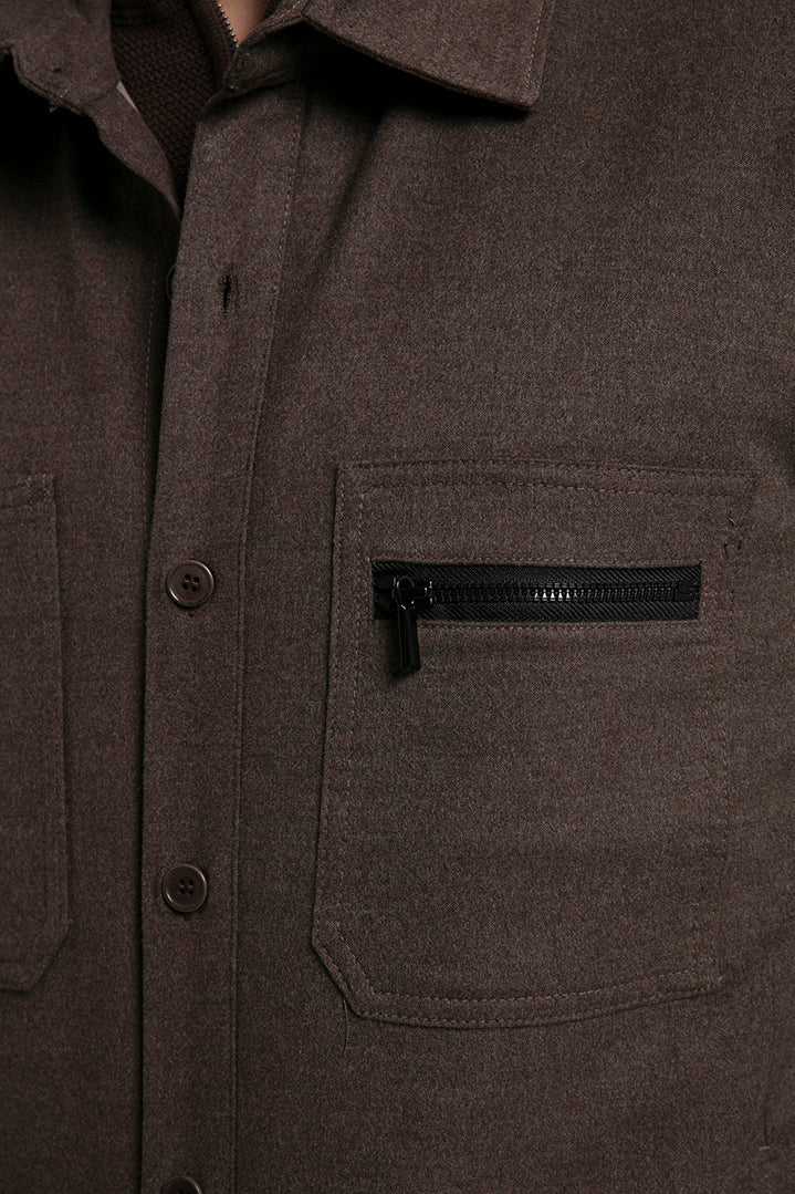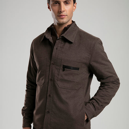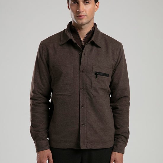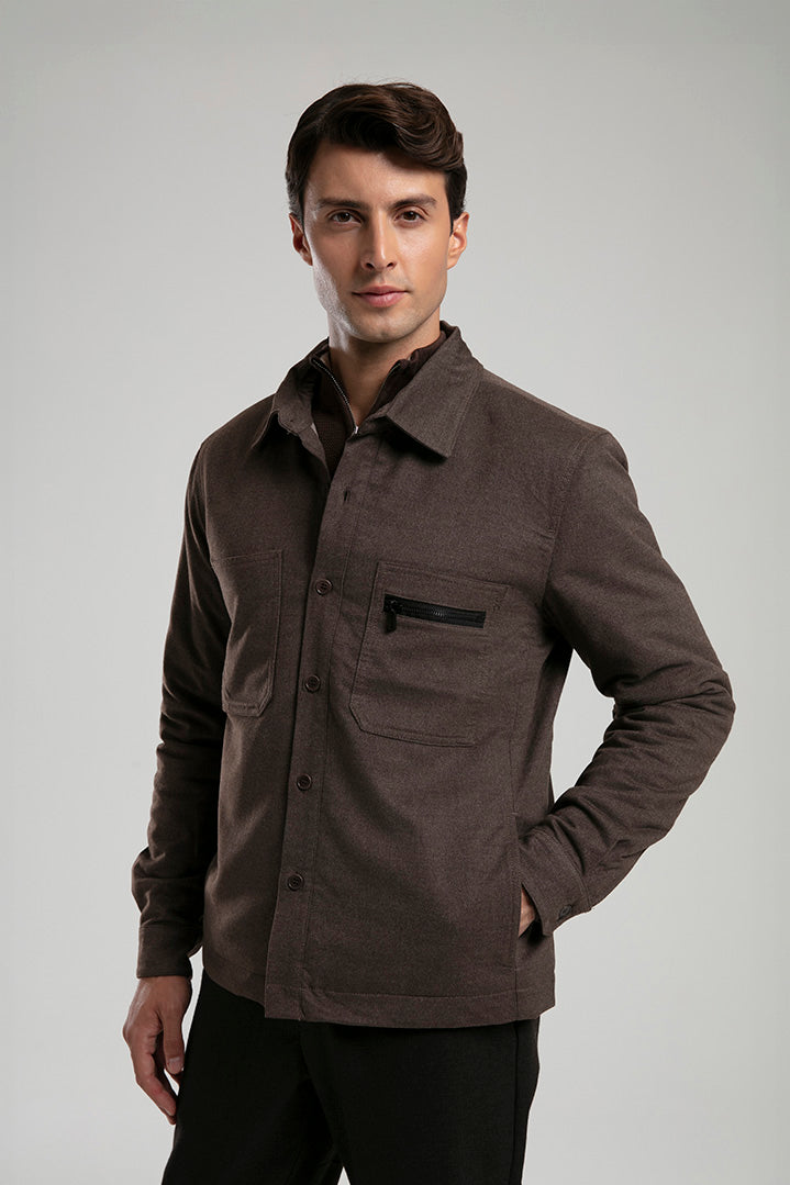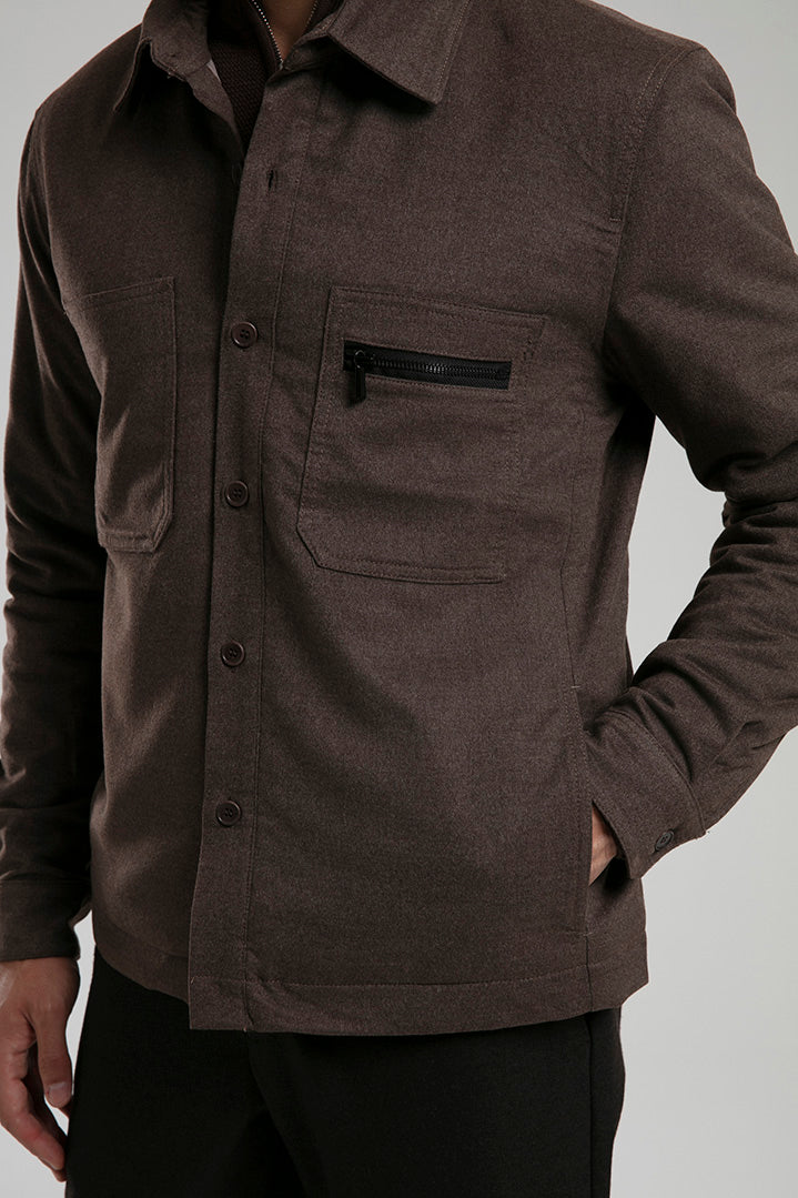 This button-up utility overshirt is a versatile staple designed for layering. Crafted from a soft yet durable fabric, it features a classic collar, button closure, and practical chest pockets, including a zippered pocket for secure storage. Its clean lines and tailored fit make it perfect to wear over a sweater or under a jacket, offering a balance of casual ease and refined style. Ideal for both workdays and weekend outings.
