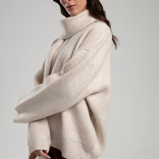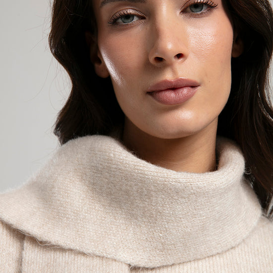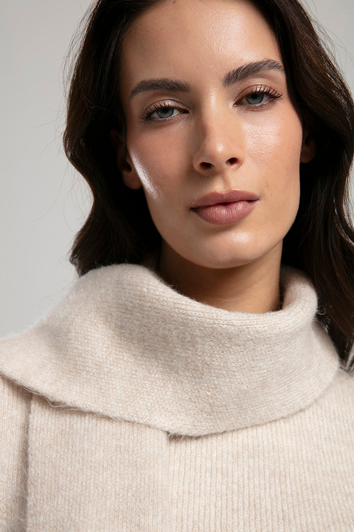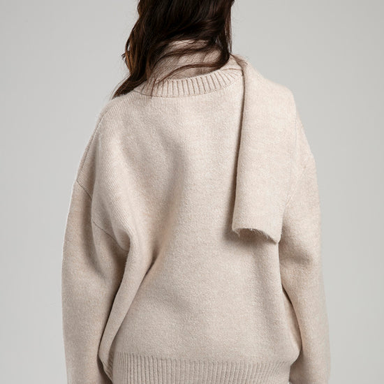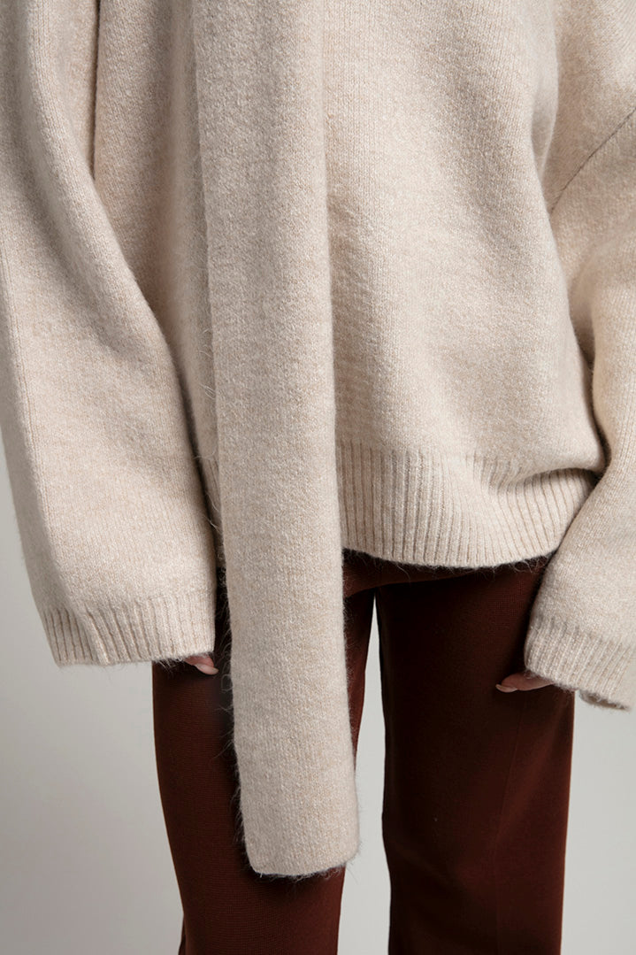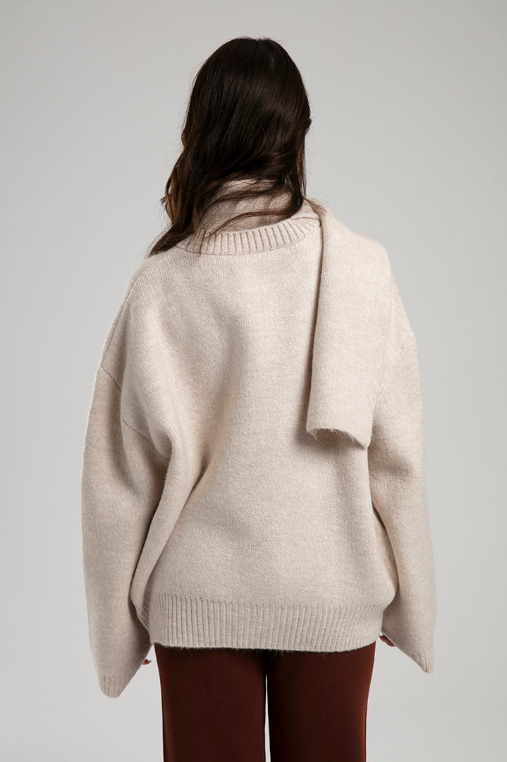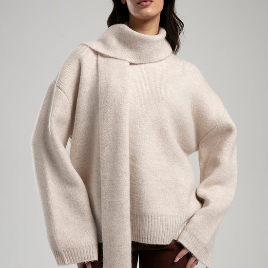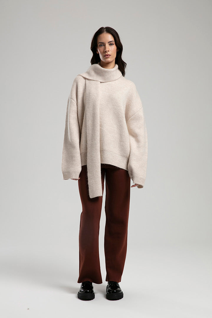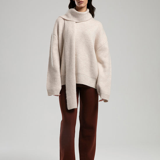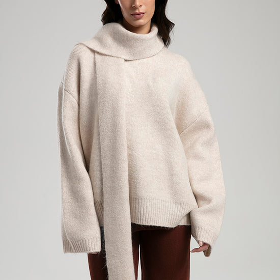 An oversized sweater featuring a high neck with an attached scarf detail for added warmth and style. Designed with dropped shoulders, wide sleeves, and ribbed cuffs, it combines cozy comfort with refined sophistication. A versatile knit that layers beautifully over trousers or skirts, making it a standout piece for cold-weather dressing.