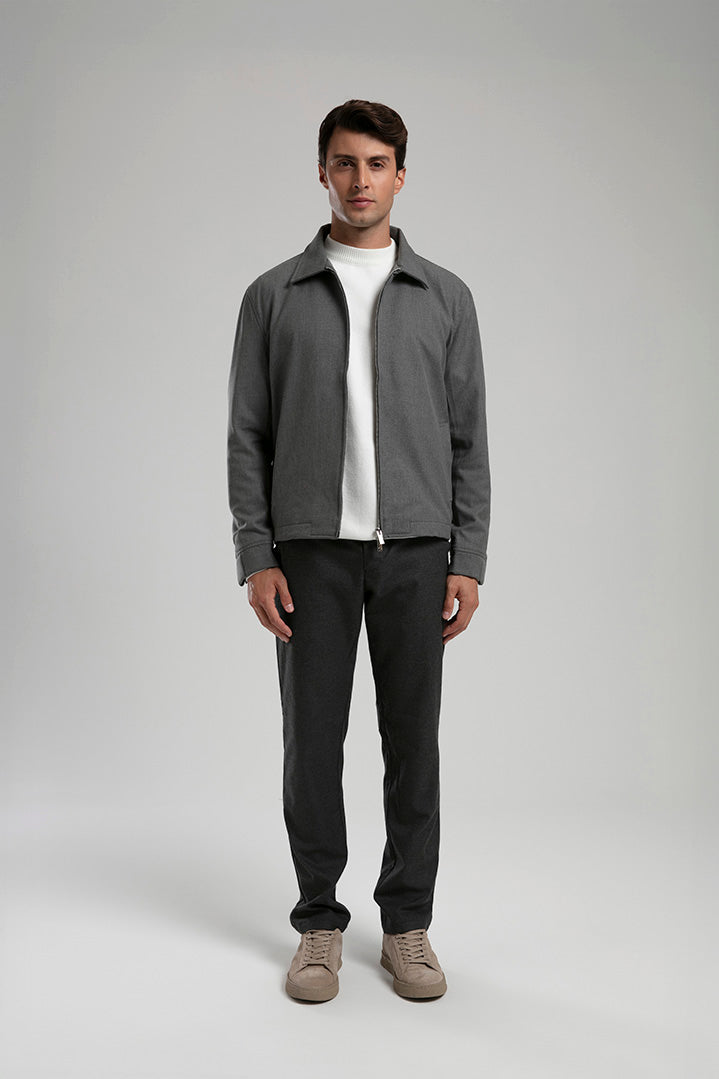 Sleek and versatile, this zip-up jacket is designed for modern sophistication. Featuring a sharp spread collar, smooth front zip closure, and discreet side pockets, it combines functionality with understated elegance. The structured silhouette makes it suitable for both casual layering and smart-casual occasions, ensuring timeless style that adapts to every wardrobe.