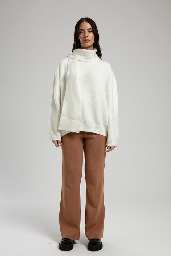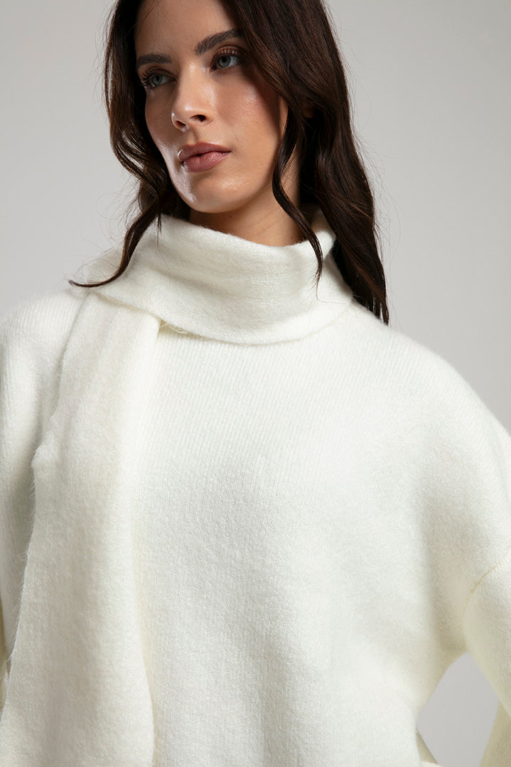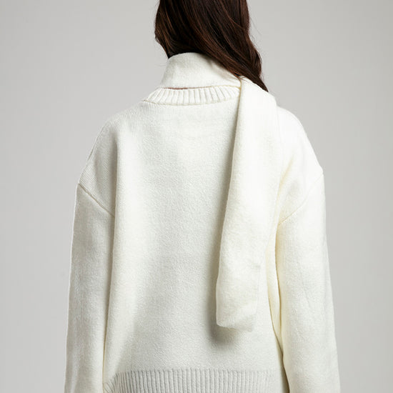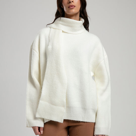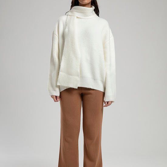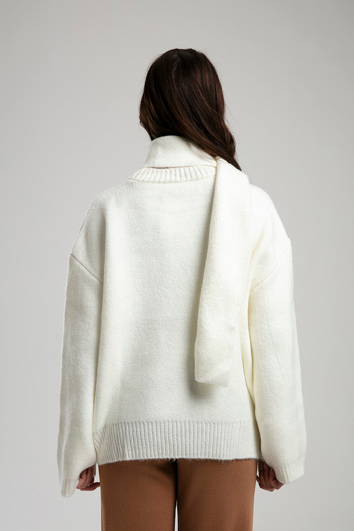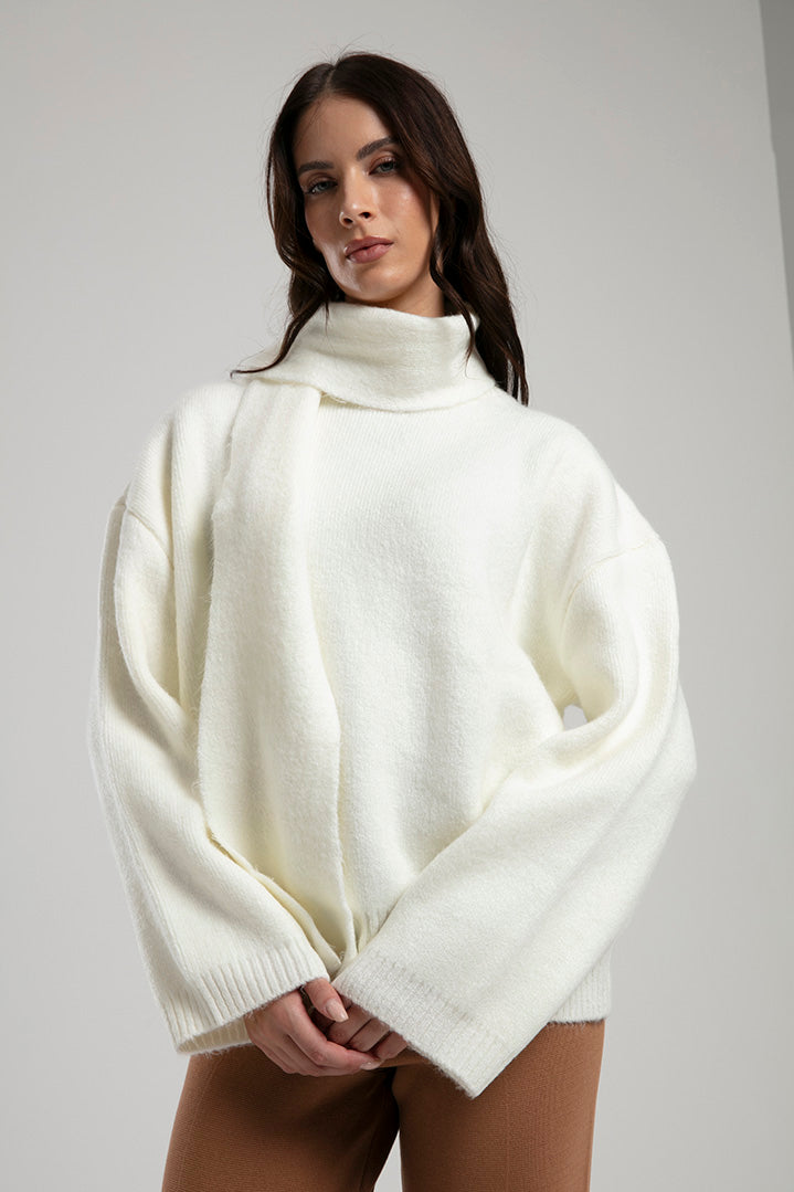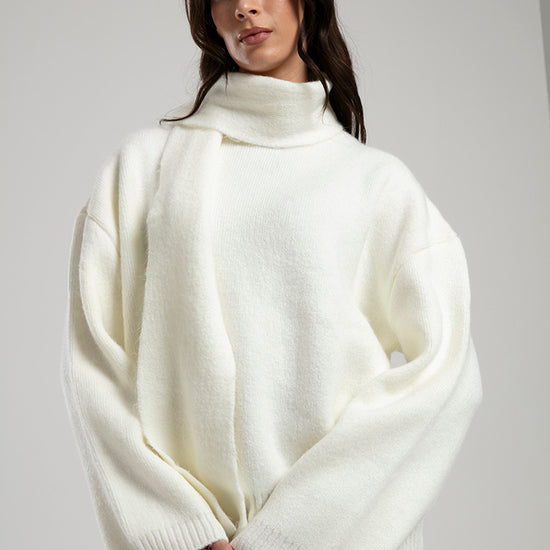 An oversized sweater featuring a high neck with an attached scarf detail for added warmth and style. Designed with dropped shoulders, wide sleeves, and ribbed cuffs, it combines cozy comfort with refined sophistication. A versatile knit that layers beautifully over trousers or skirts, making it a standout piece for cold-weather dressing.