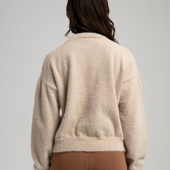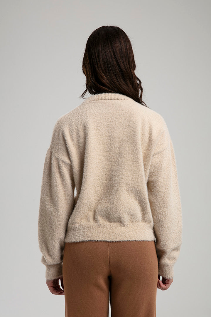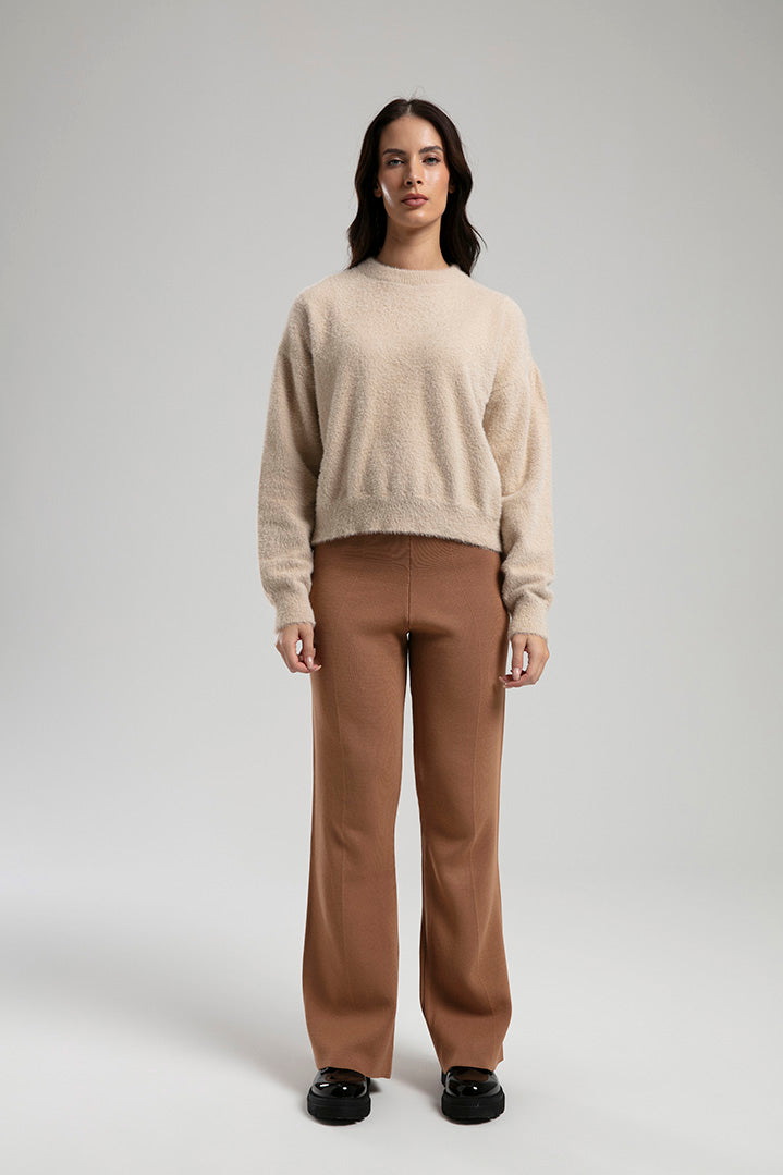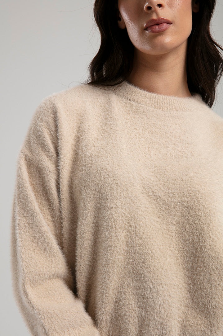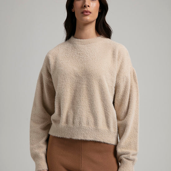 A cozy knit sweater crafted from a soft textured fabric for warmth and comfort. Designed with a relaxed fit, dropped shoulders, and a classic crew neckline, it’s an effortless layering piece that pairs seamlessly with tailored trousers or casual denim. Perfect for elevating everyday looks with understated sophistication.