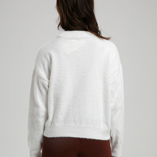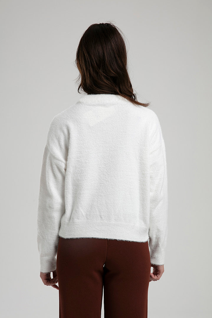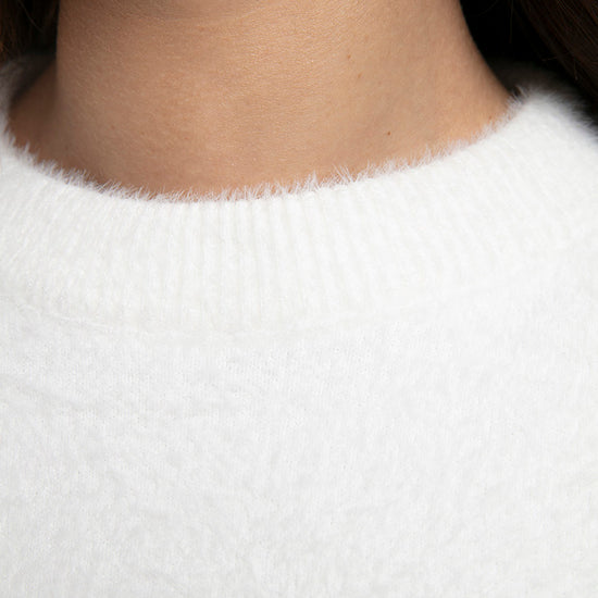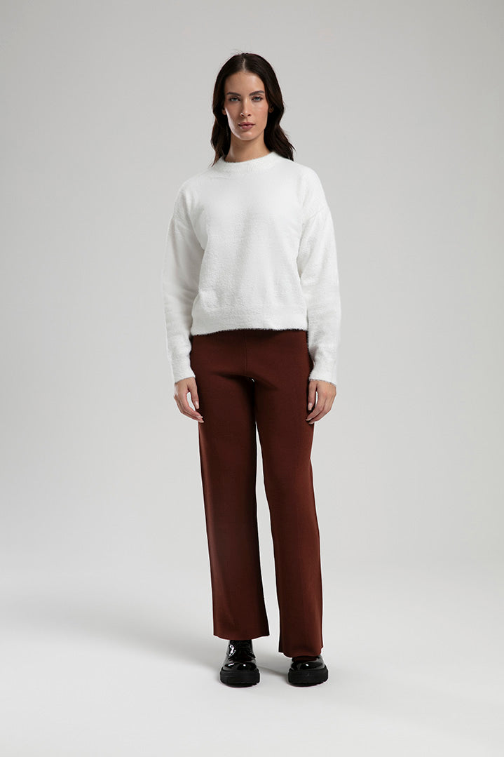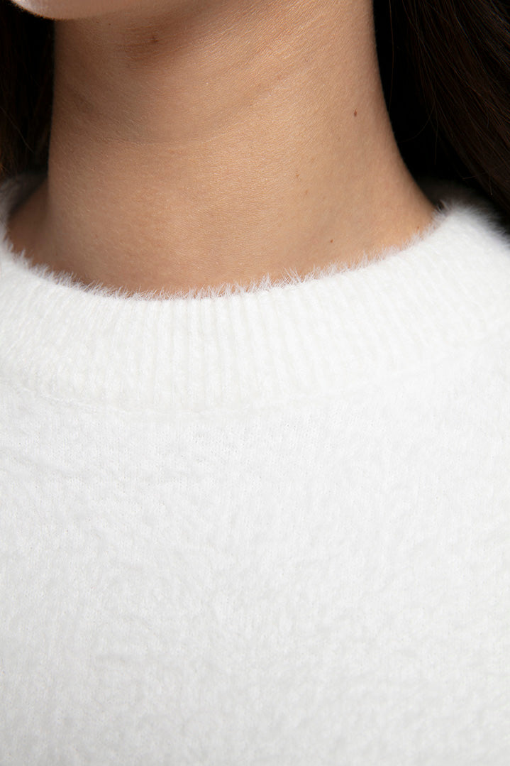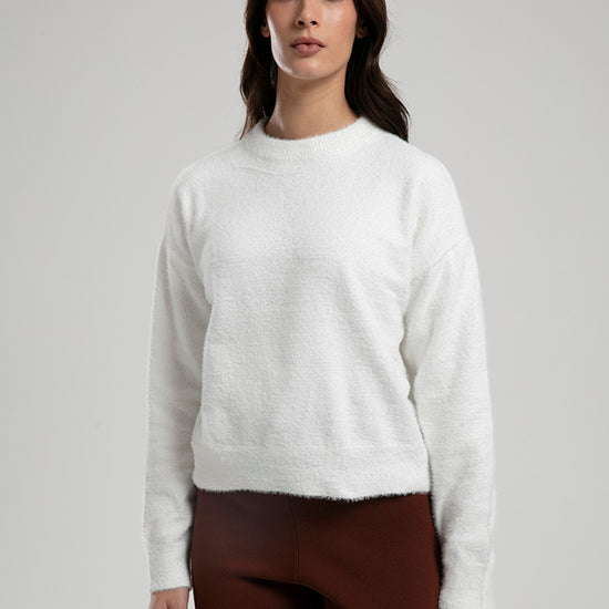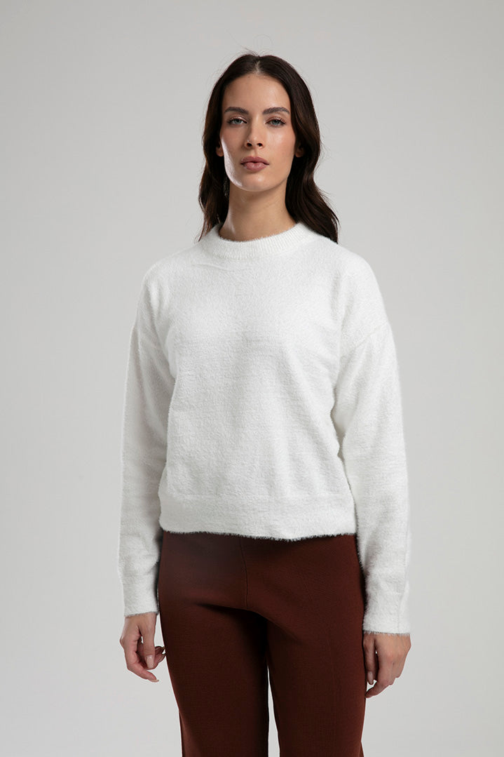 A cozy knit sweater crafted from a soft textured fabric for warmth and comfort. Designed with a relaxed fit, dropped shoulders, and a classic crew neckline, it’s an effortless layering piece that pairs seamlessly with tailored trousers or casual denim. Perfect for elevating everyday looks with understated sophistication.