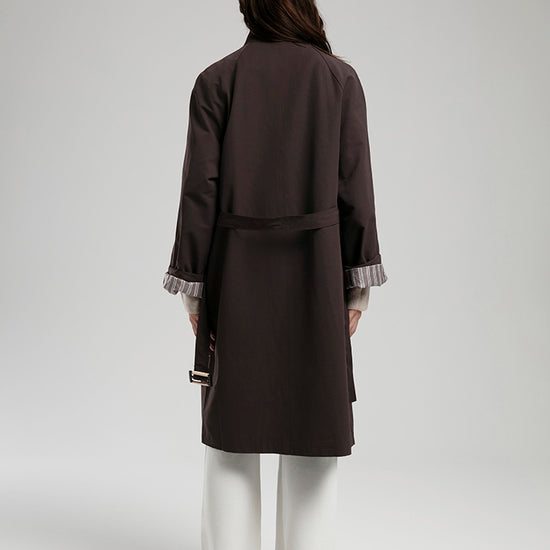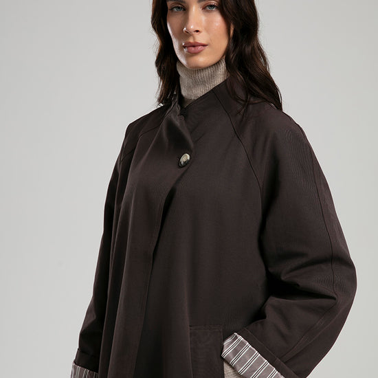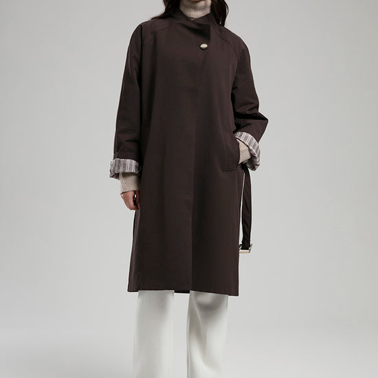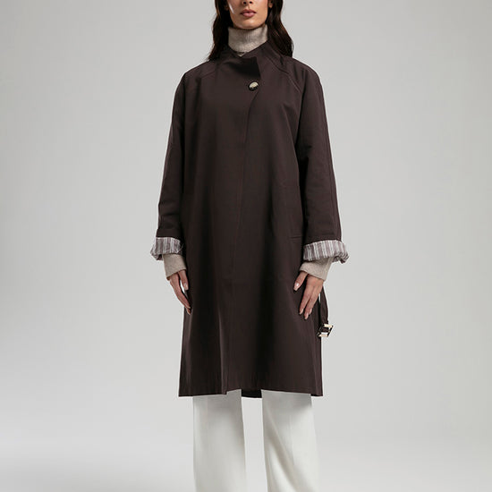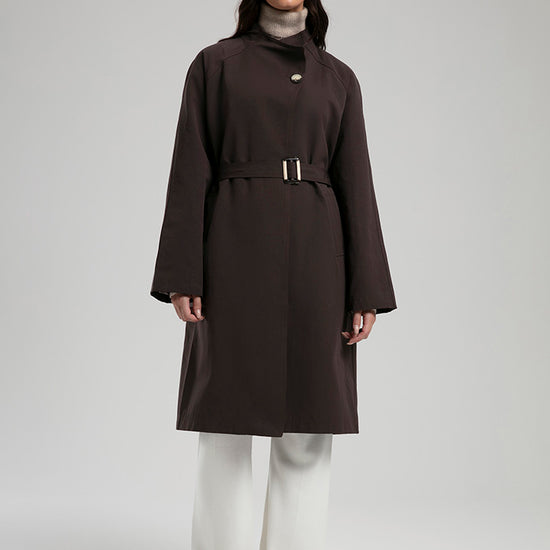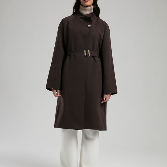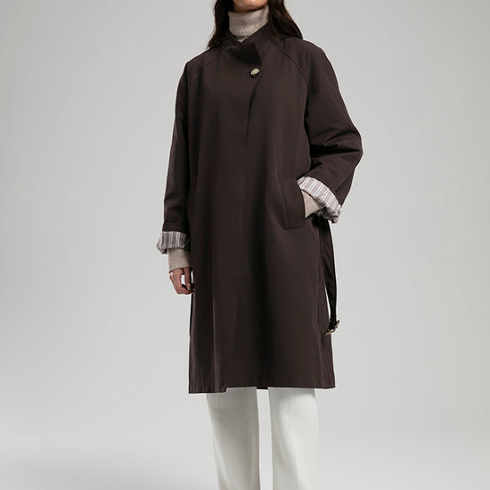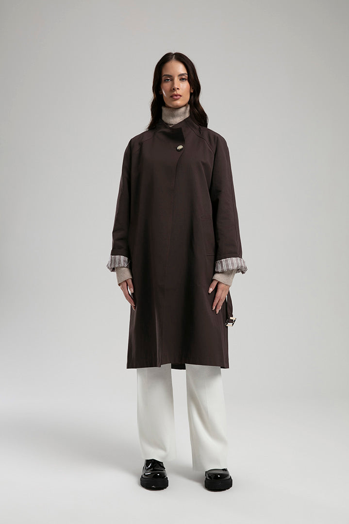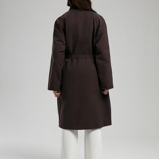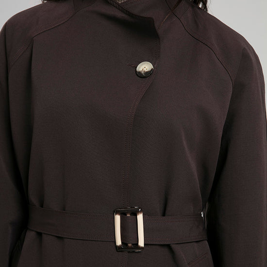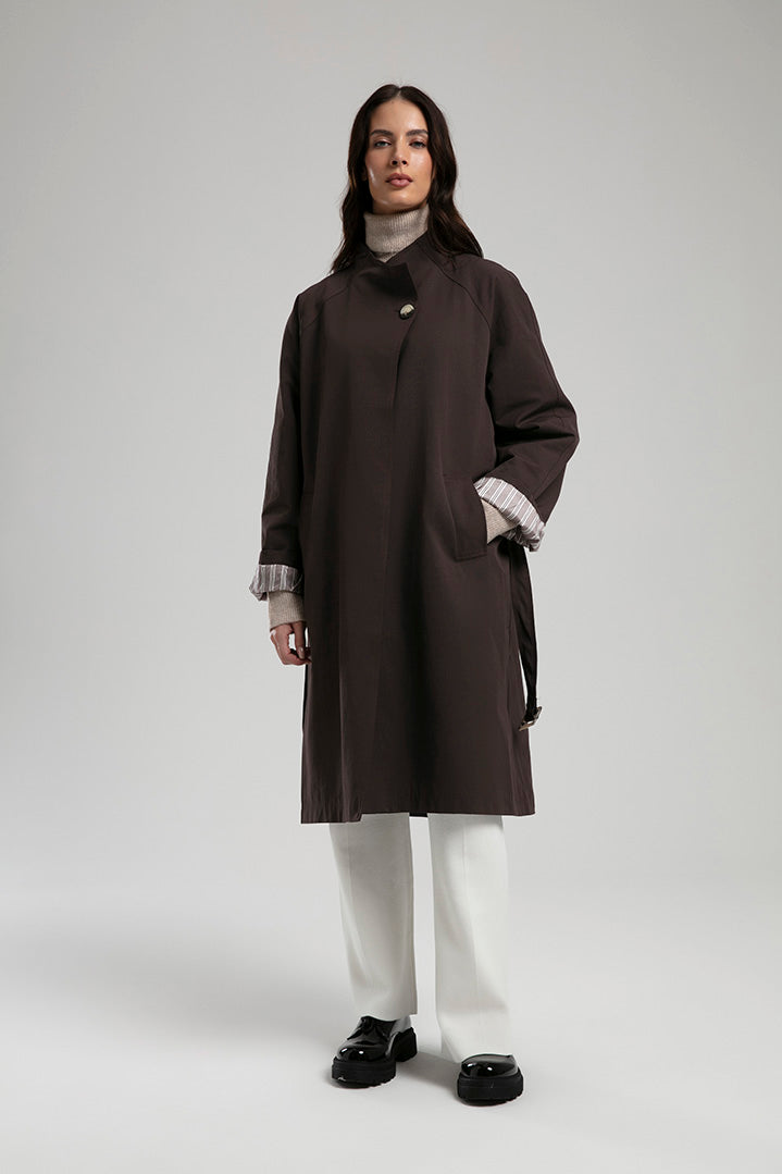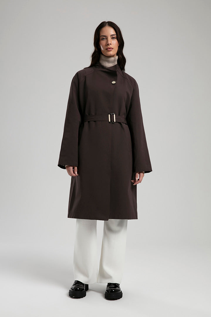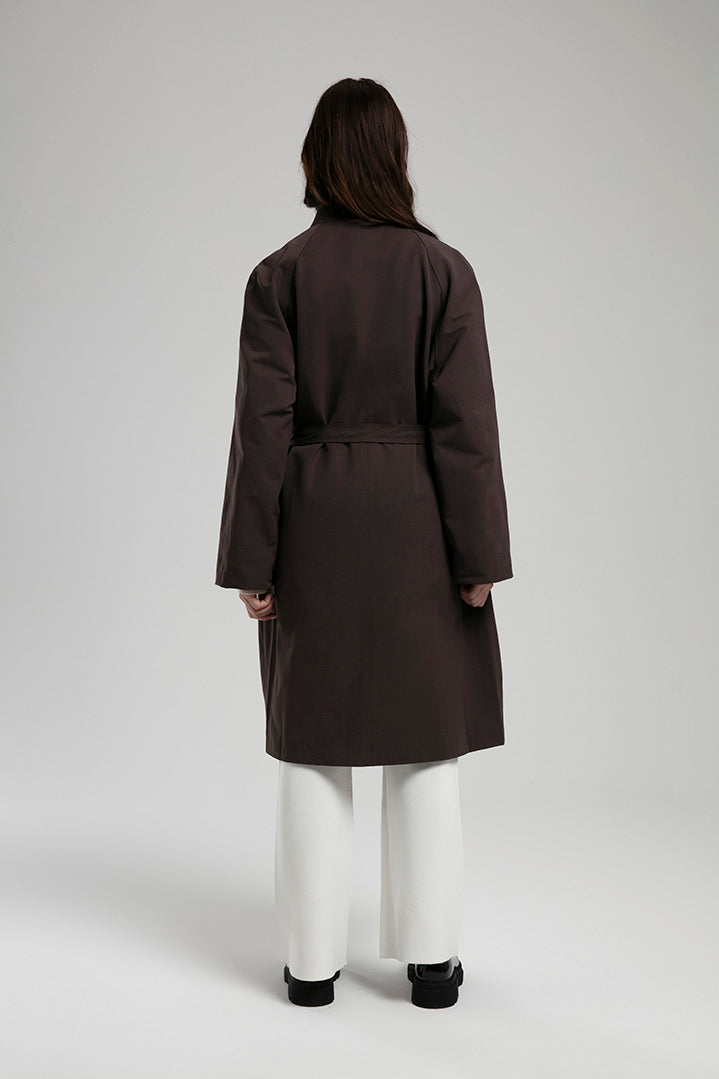 A sleek waterproof coat in a deep chocolate hue, designed with a minimalist silhouette and a single-button neckline. Crafted from a water-resistant fabric, it offers lightweight protection against rain while maintaining a refined, modern look. Featuring side pockets and a belted back detail, this coat is practical yet stylish — perfect for transitional weather and city wear.