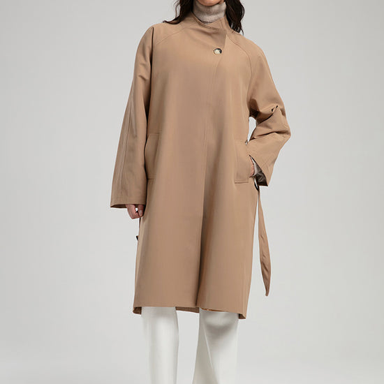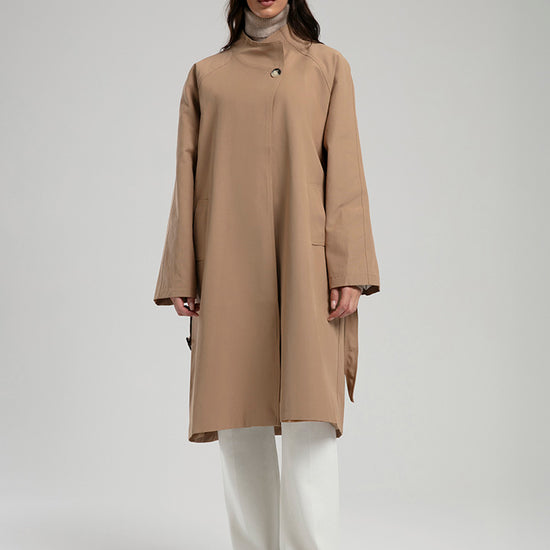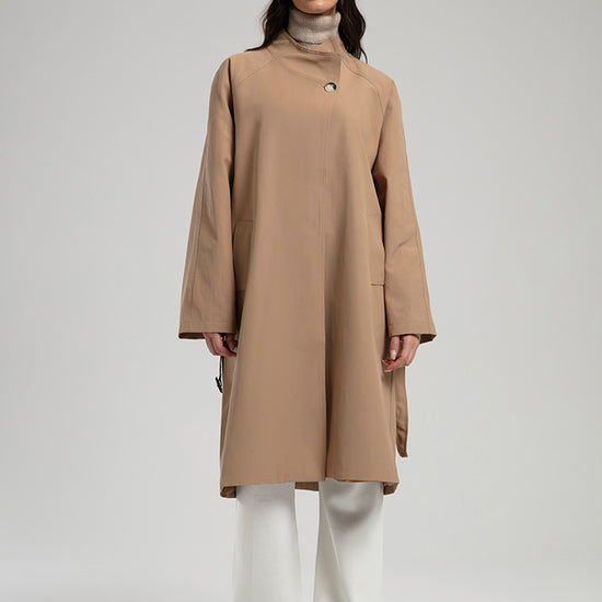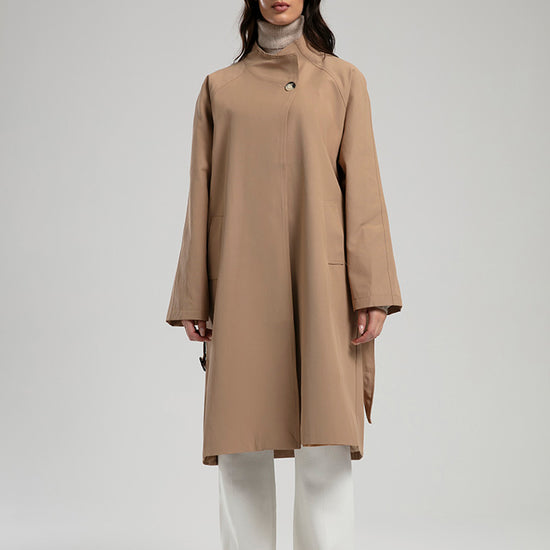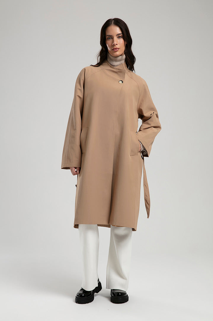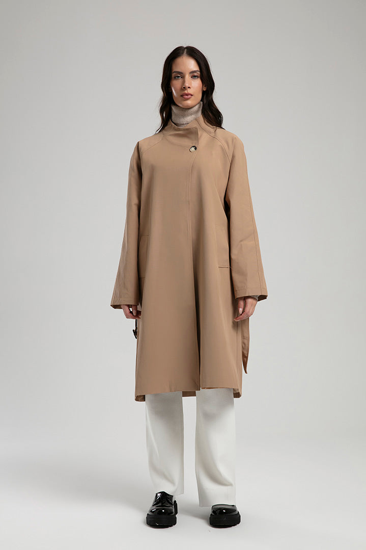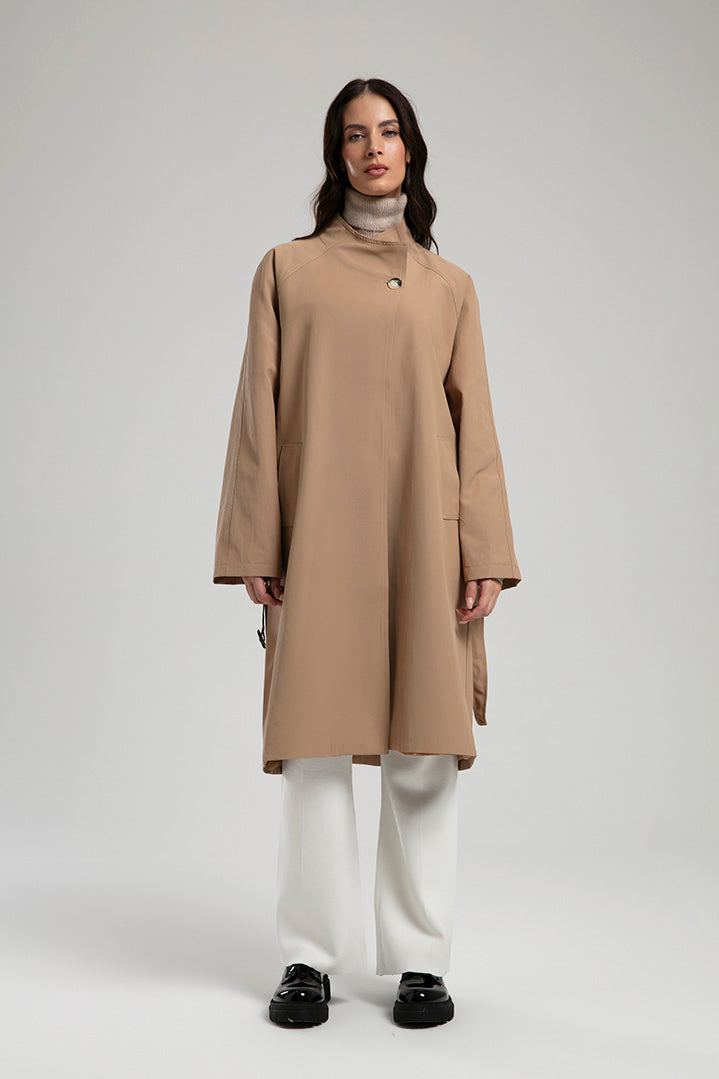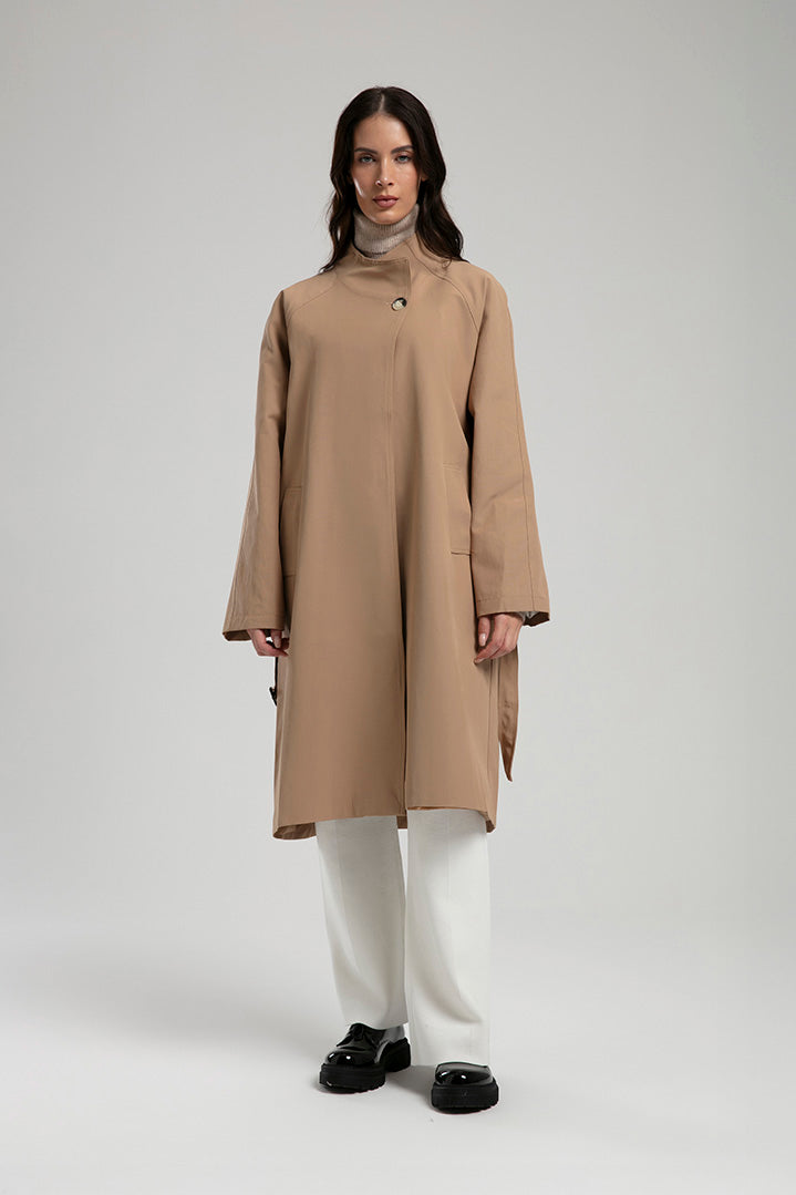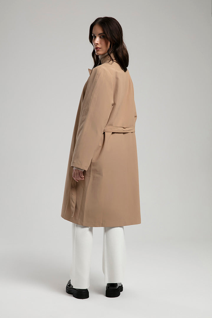 A sleek waterproof coat in a deep chocolate hue, designed with a minimalist silhouette and a single-button neckline. Crafted from a water-resistant fabric, it offers lightweight protection against rain while maintaining a refined, modern look. Featuring side pockets and a belted back detail, this coat is practical yet stylish — perfect for transitional weather and city wear.