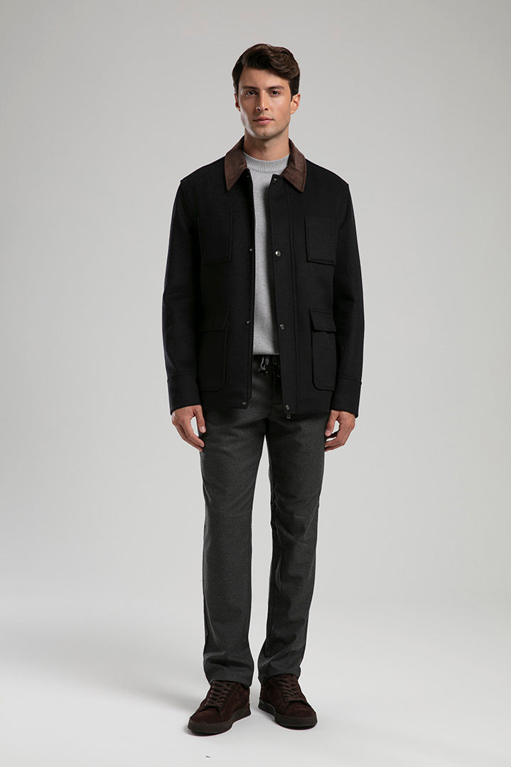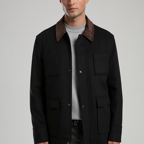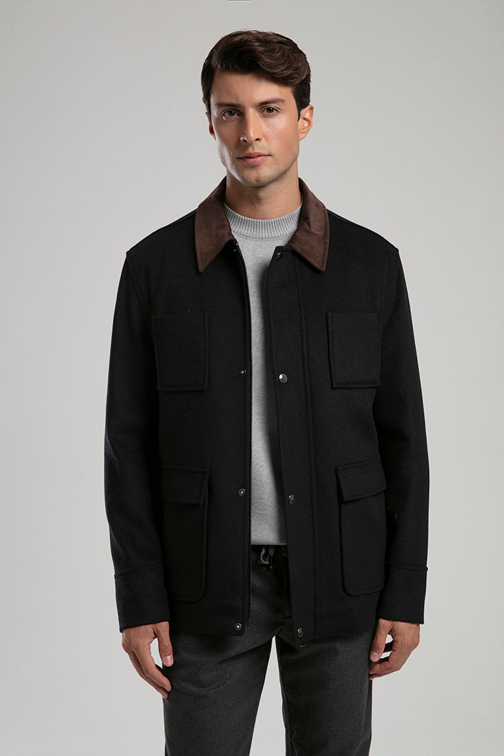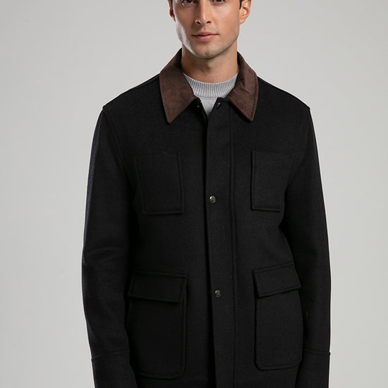This wool-blend utility jacket blends rugged charm with refined tailoring. Designed with a contrasting dark collar and four front flap pockets, it offers both functionality and timeless appeal. The structured silhouette and button-up front provide warmth and versatility, making it perfect for layering over casual or smart outfits during cooler seasons.