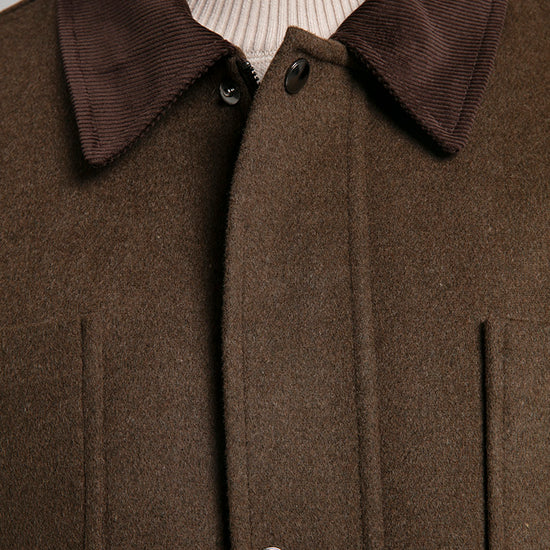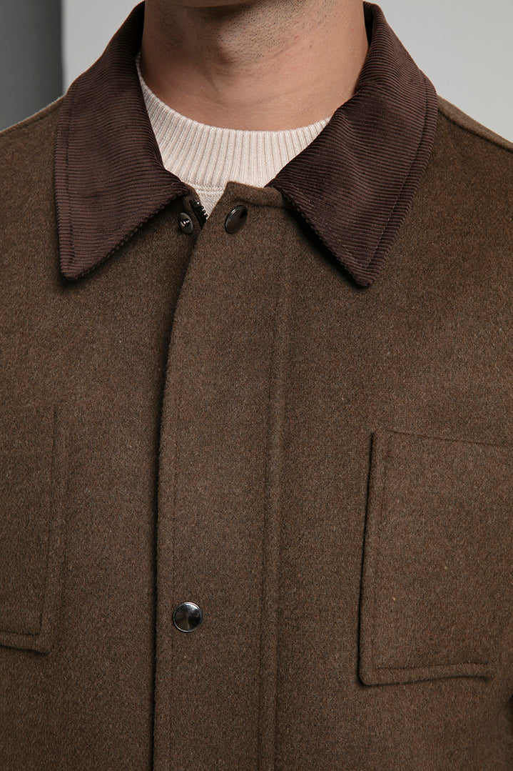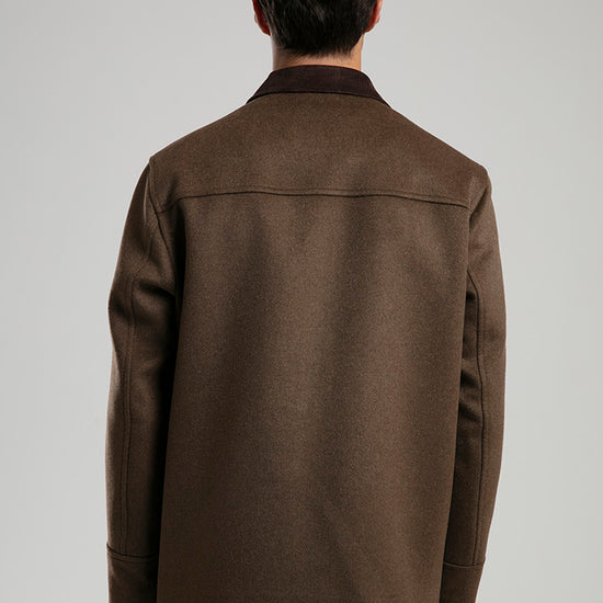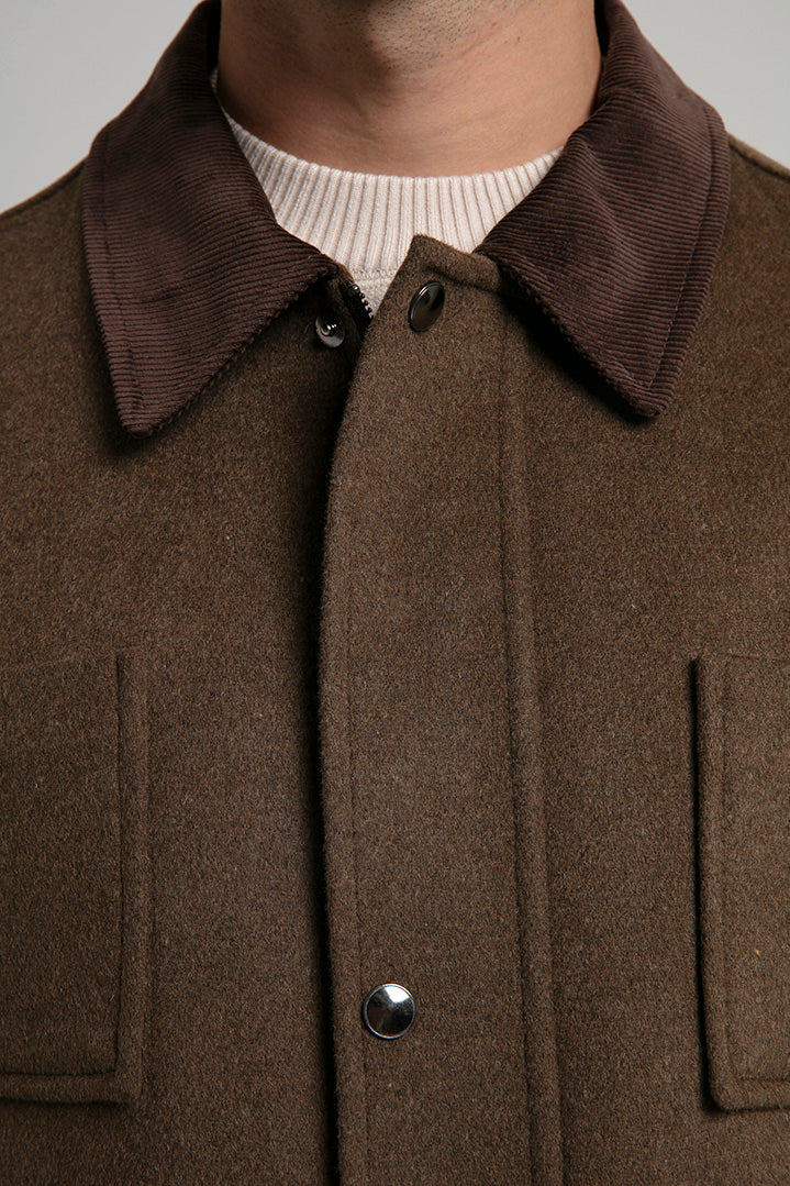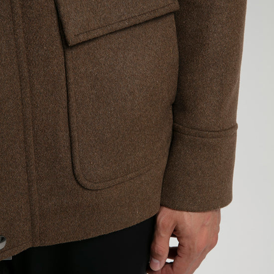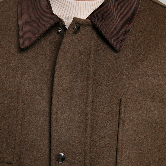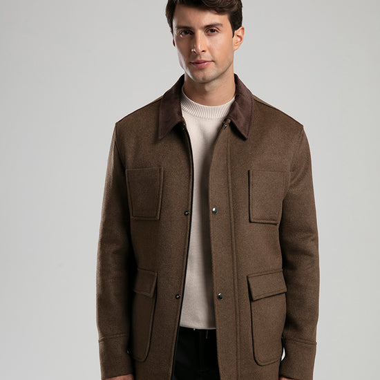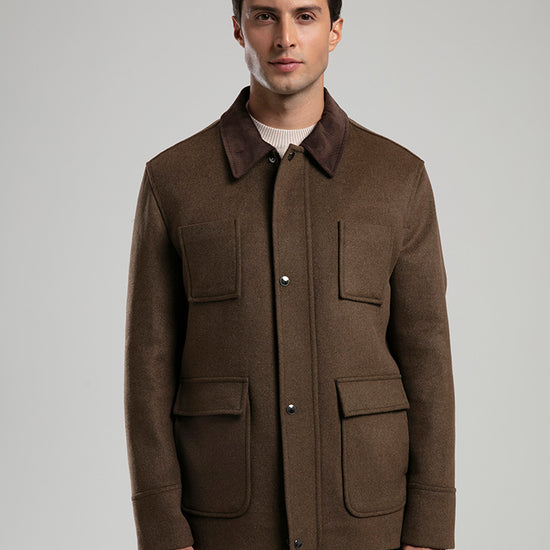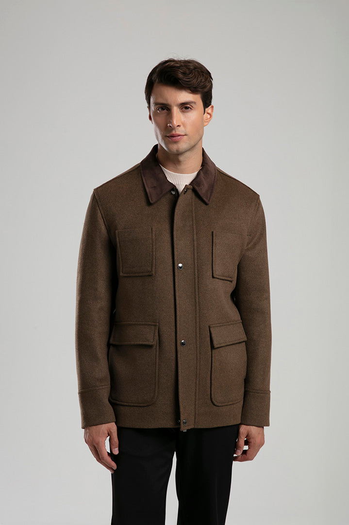This wool-blend utility jacket blends rugged charm with refined tailoring. Designed with a contrasting dark collar and four front flap pockets, it offers both functionality and timeless appeal. The structured silhouette and button-up front provide warmth and versatility, making it perfect for layering over casual or smart outfits during cooler seasons.