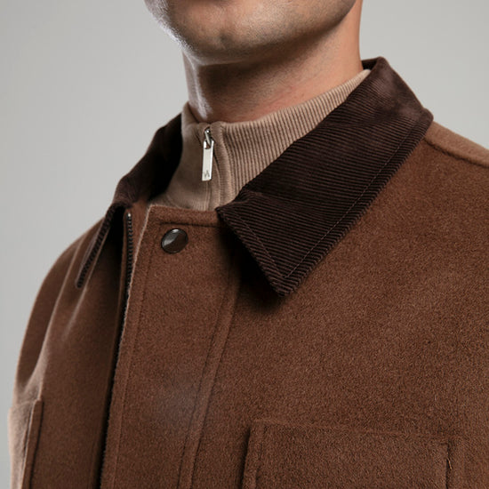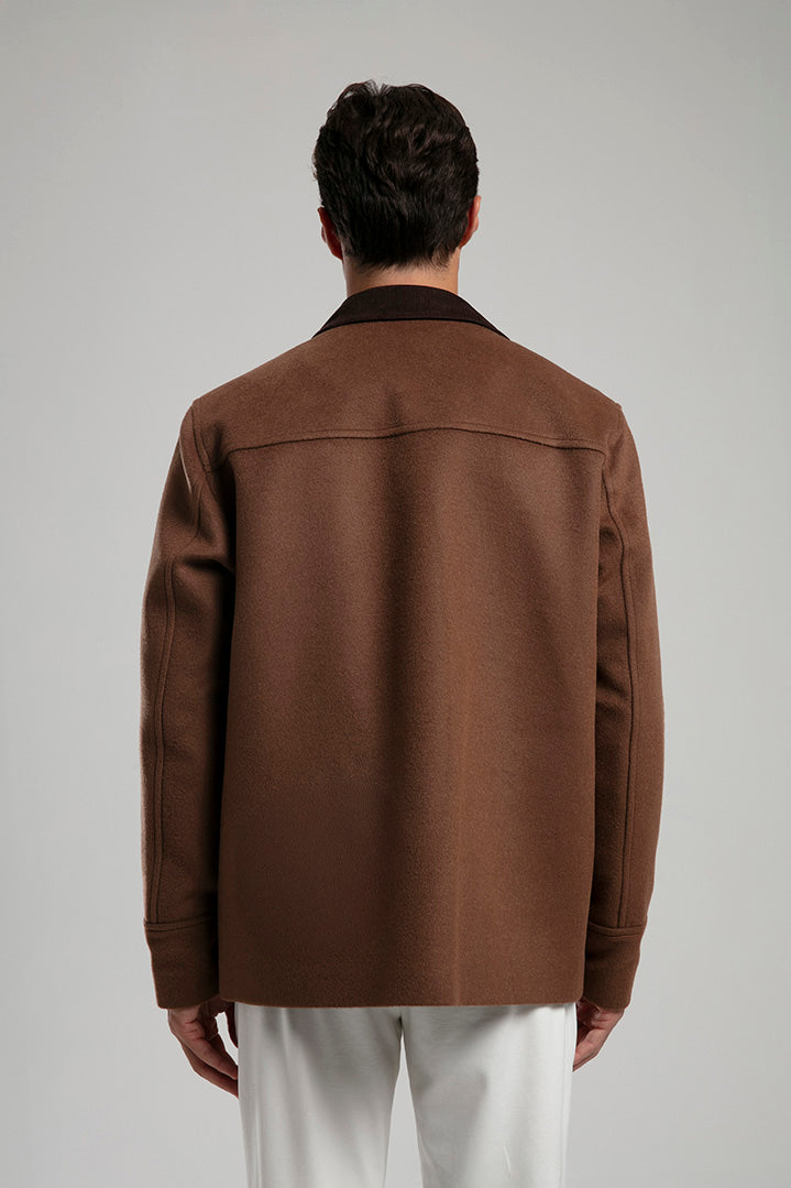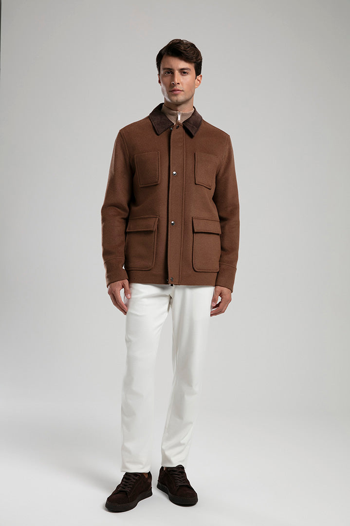 This wool-blend utility jacket blends rugged charm with refined tailoring. Designed with a contrasting dark collar and four front flap pockets, it offers both functionality and timeless appeal. The structured silhouette and button-up front provide warmth and versatility, making it perfect for layering over casual or smart outfits during cooler seasons.