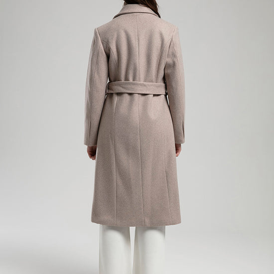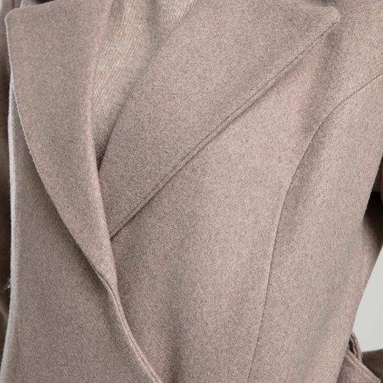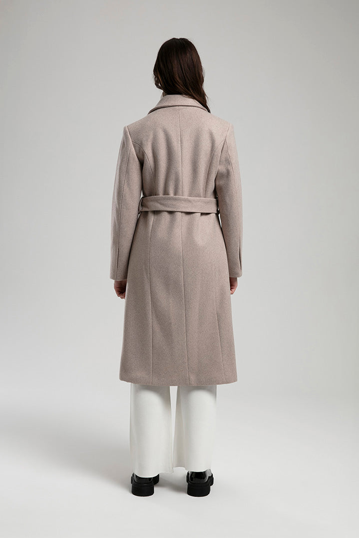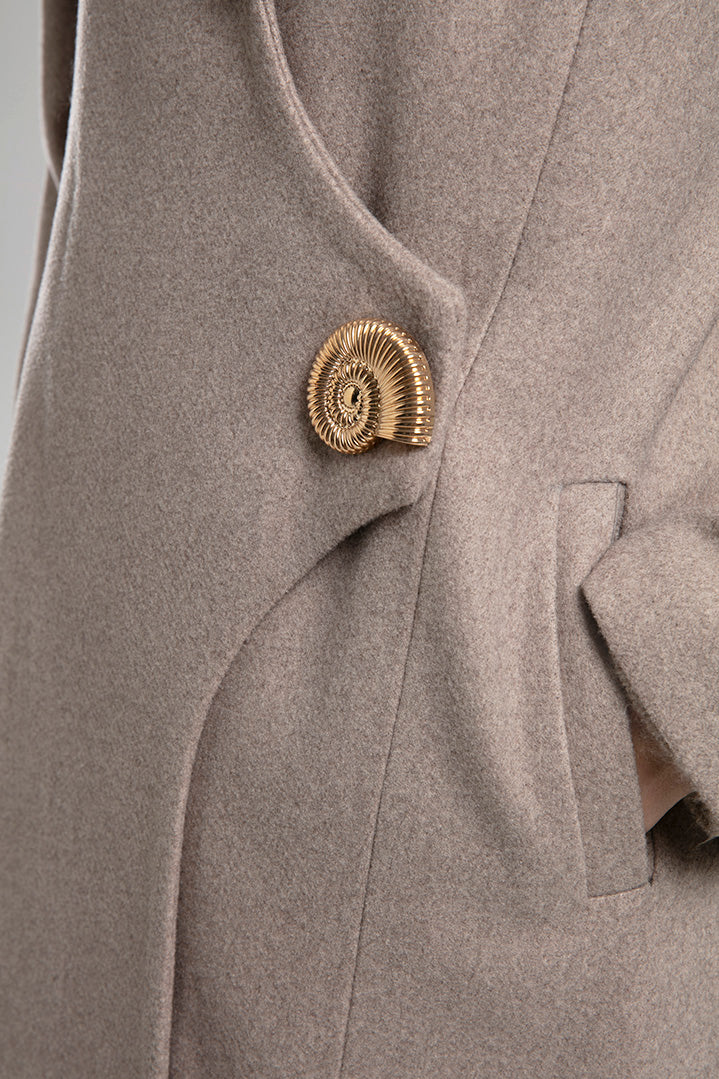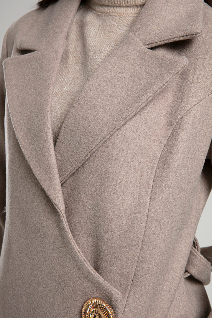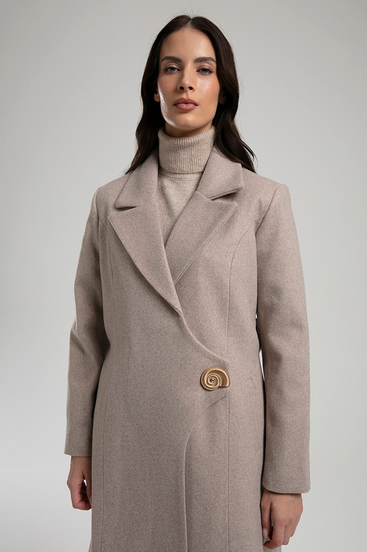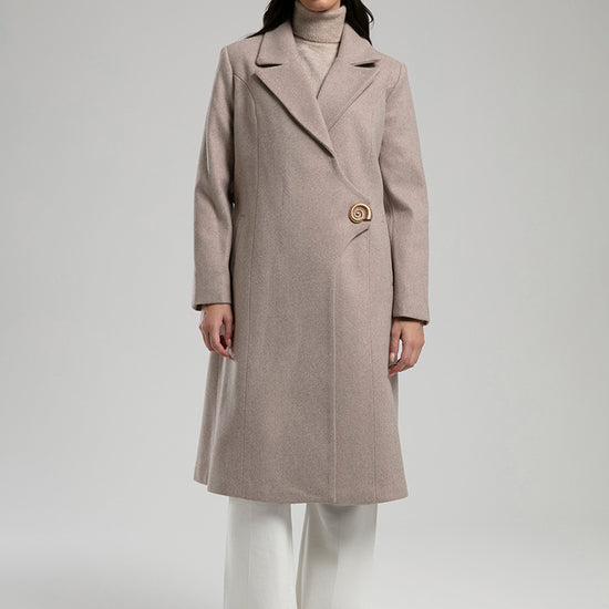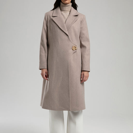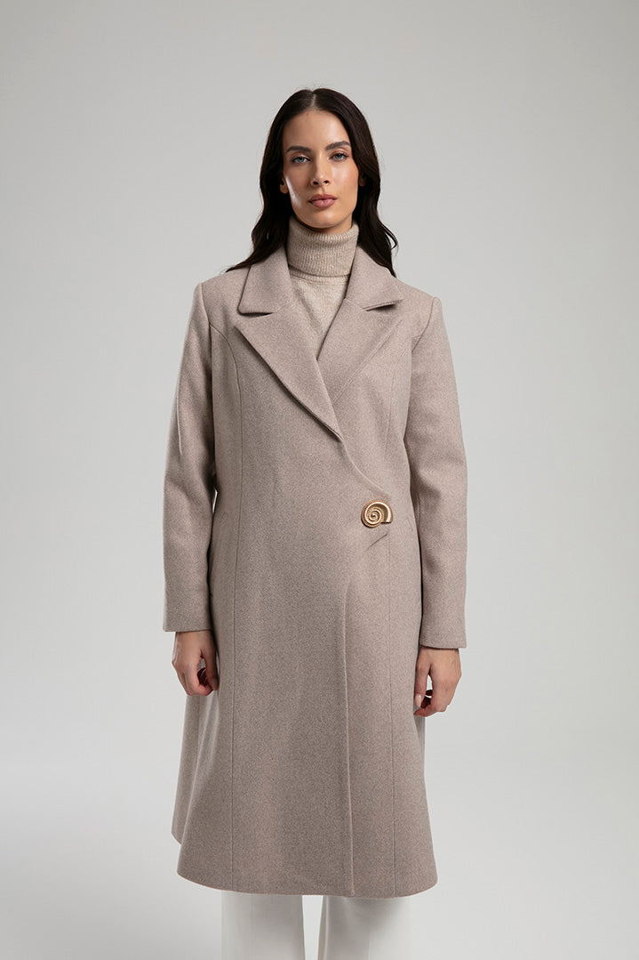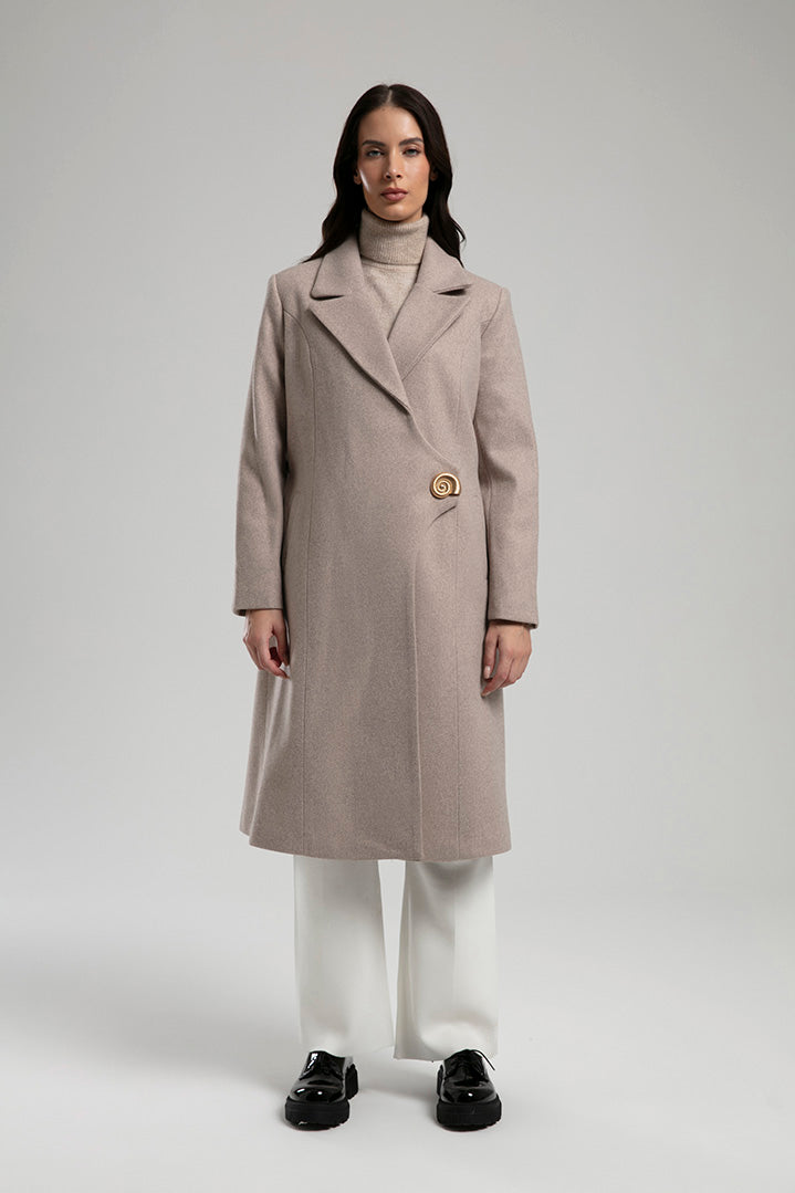 Modern minimalism meets subtle luxury in this taupe wool coat, designed with a sleek silhouette and a distinctive statement button closure. The tailored fit, sharp lapels, and clean lines make it a versatile piece that transitions seamlessly from day to evening. Crafted from a premium wool blend, it offers warmth, comfort, and effortless elegance. A refined wardrobe staple that elevates any outfit with its understated sophistication