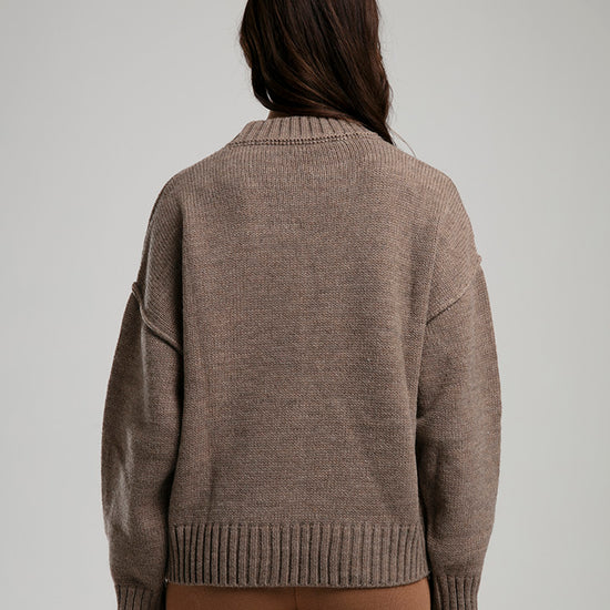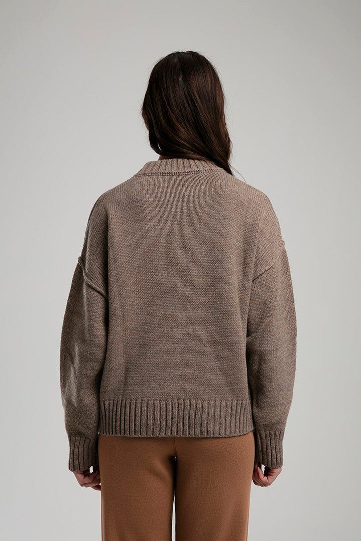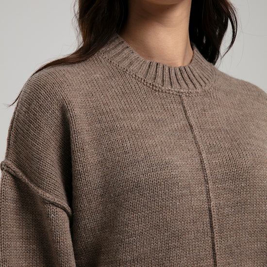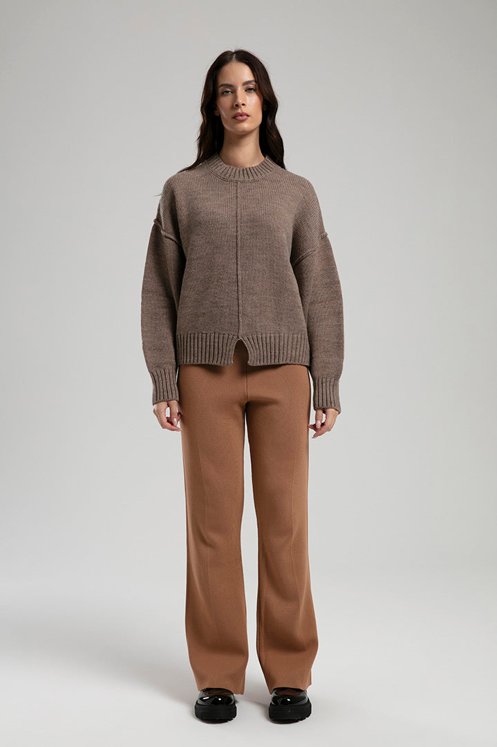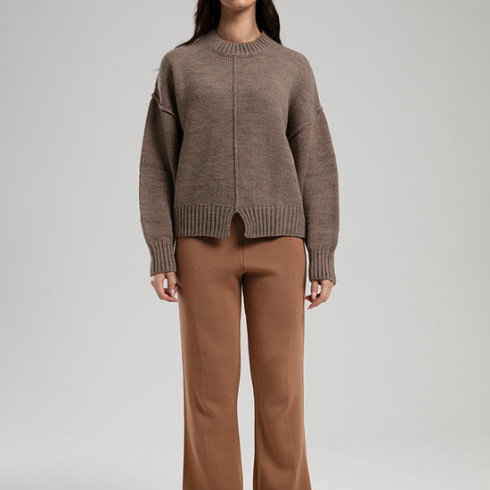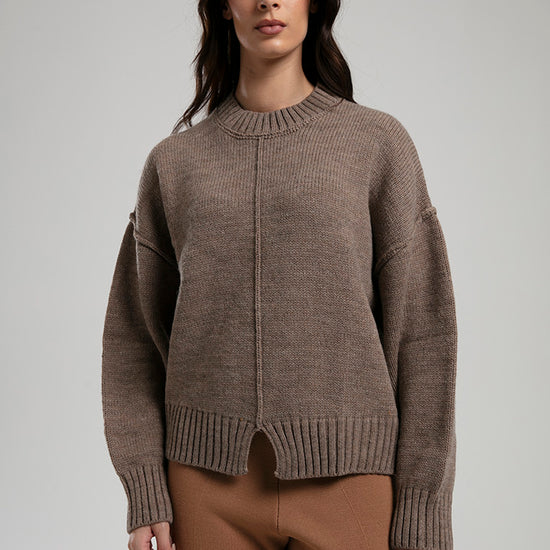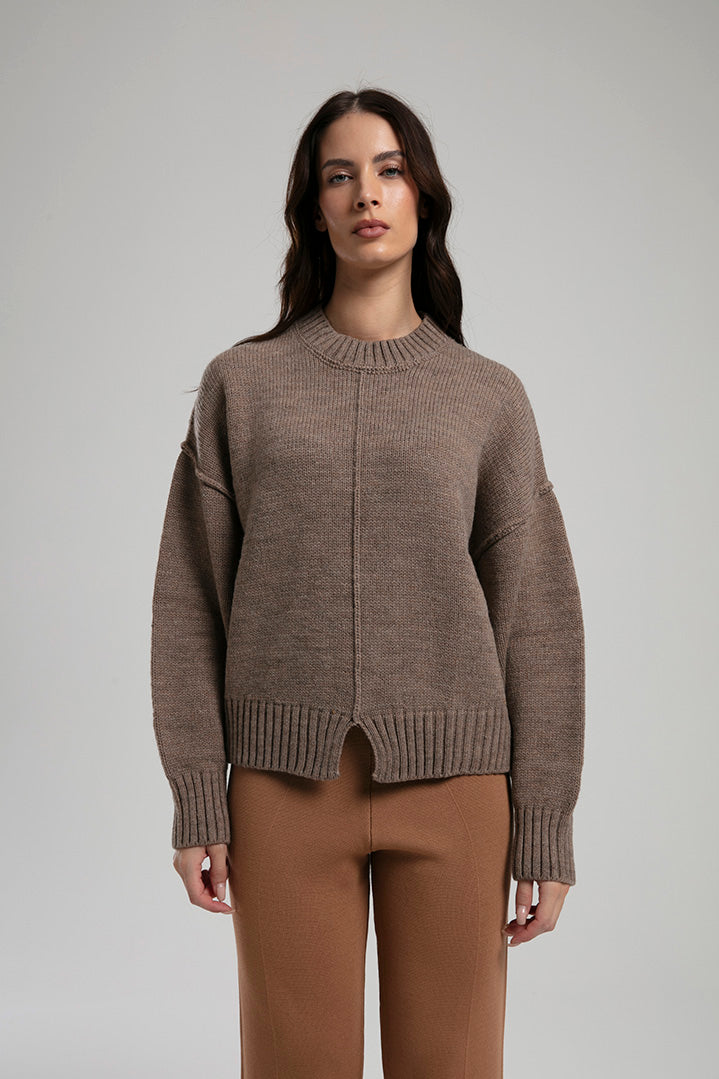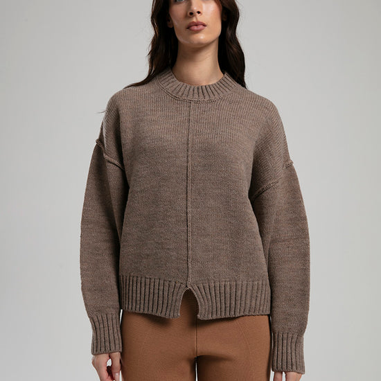 A wool sweater featuring a relaxed fit with dropped shoulders and ribbed detailing at the collar, cuffs, and hem. The central seam and subtle front slit add a modern touch to this classic knit. Perfect for layering with tailored trousers or denim, it brings effortless style and comfort to everyday looks.