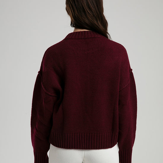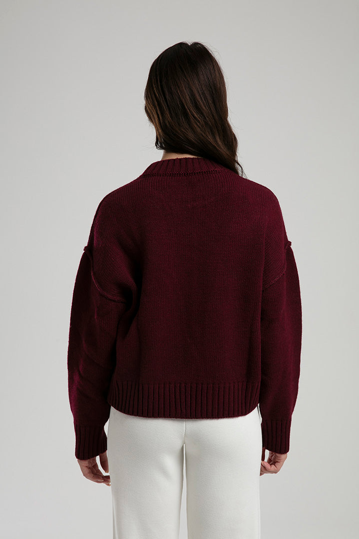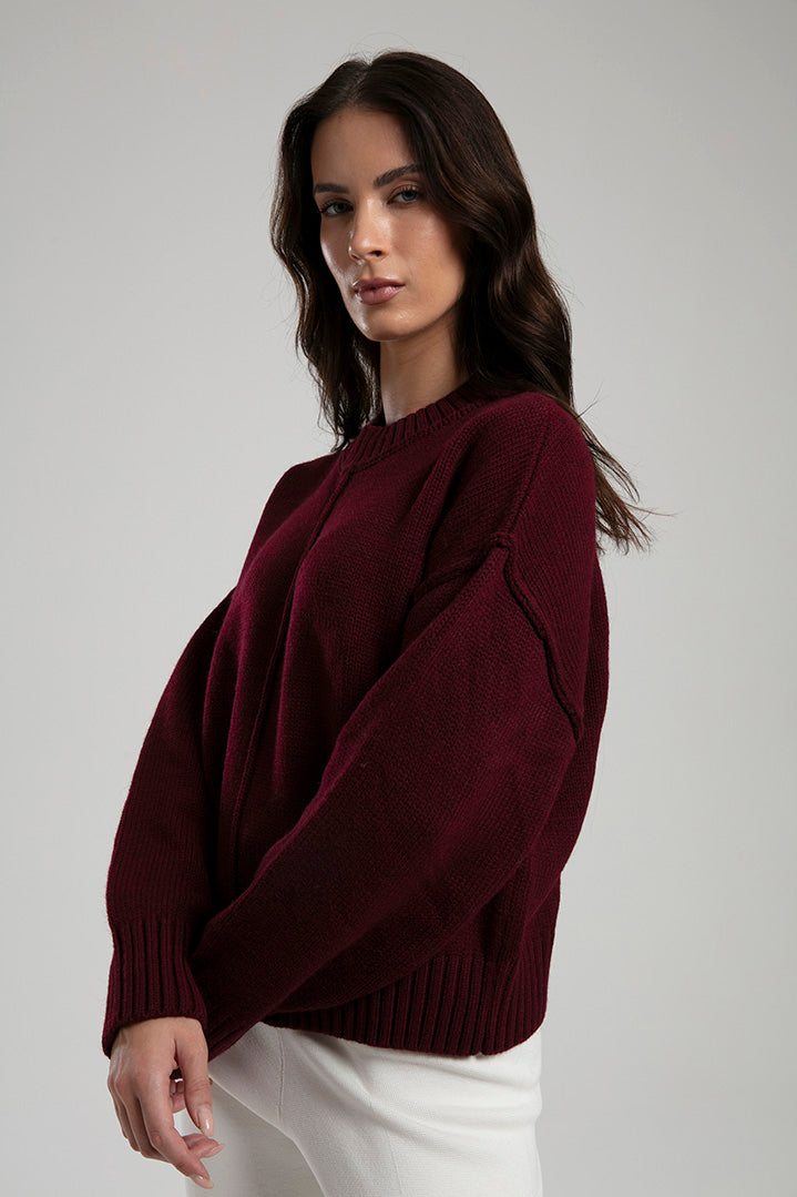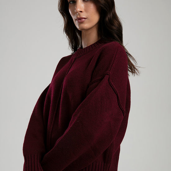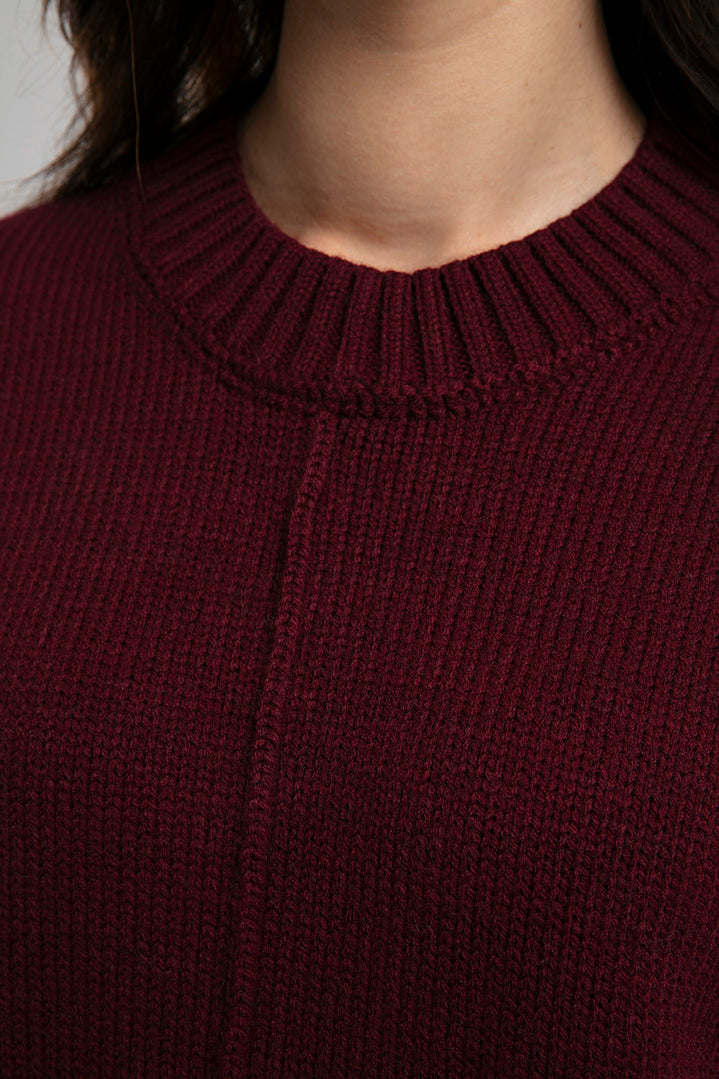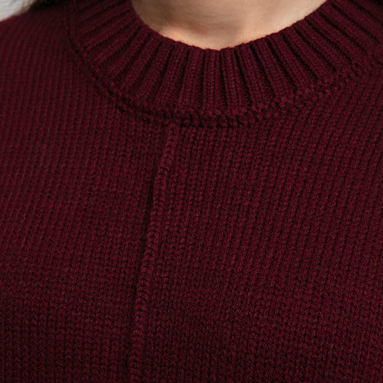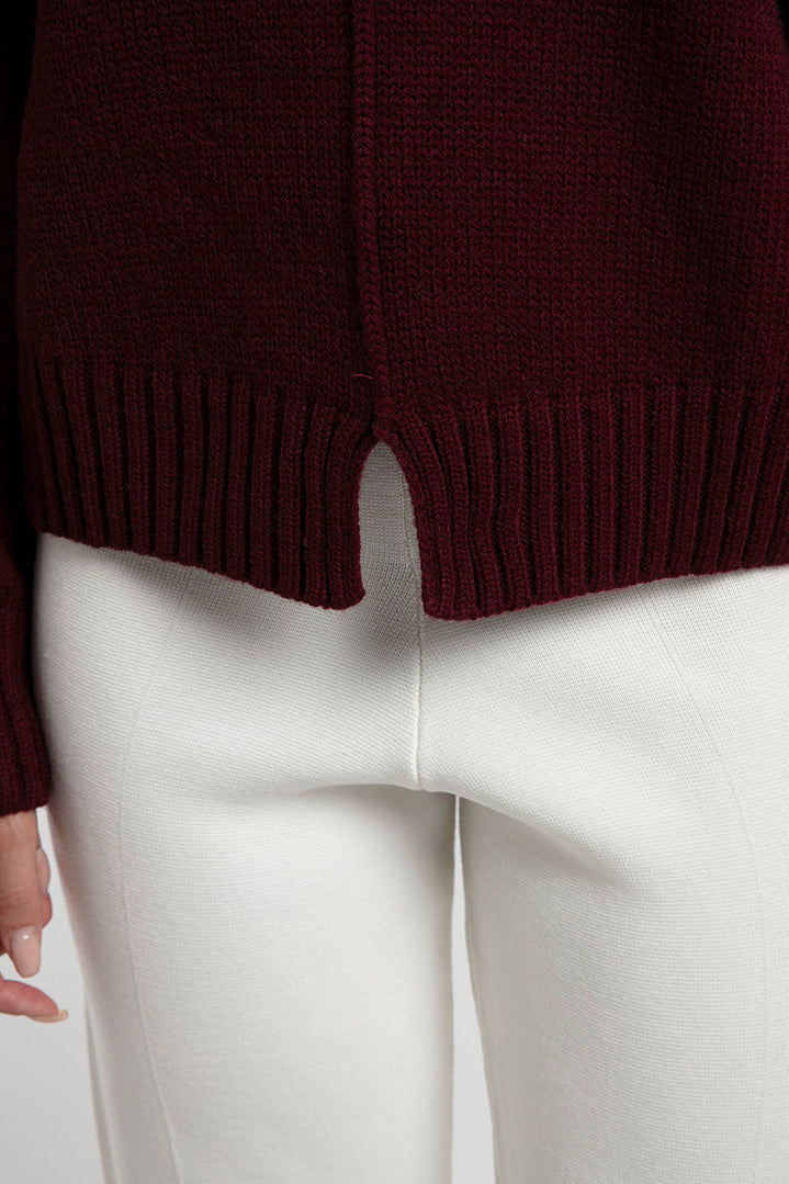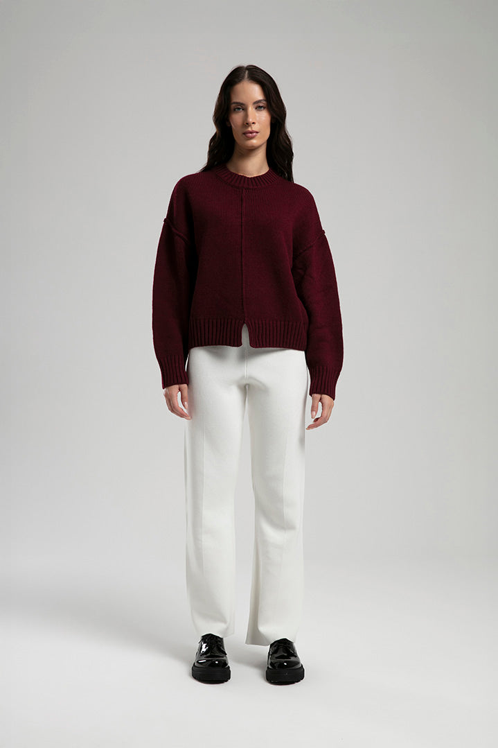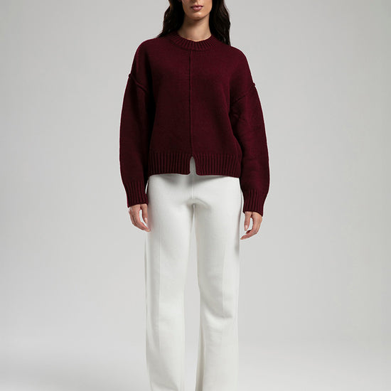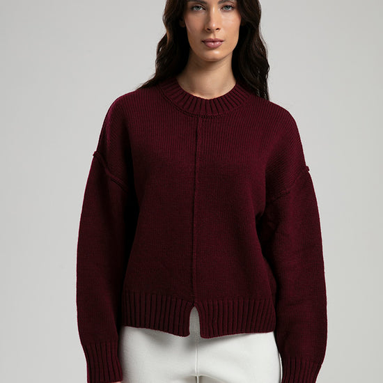 A wool sweater featuring a relaxed fit with dropped shoulders and ribbed detailing at the collar, cuffs, and hem. The central seam and subtle front slit add a modern touch to this classic knit. Perfect for layering with tailored trousers or denim, it brings effortless style and comfort to everyday looks.