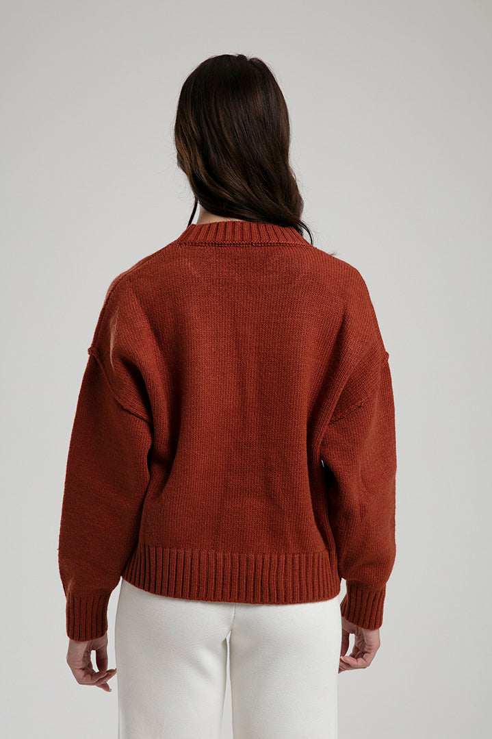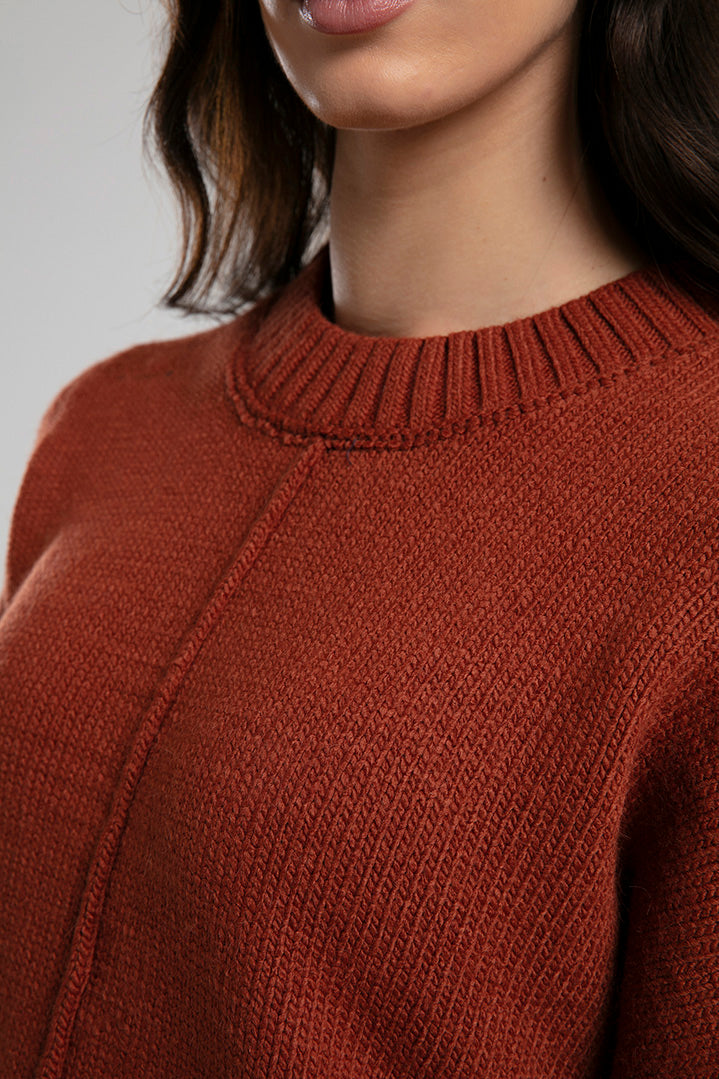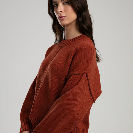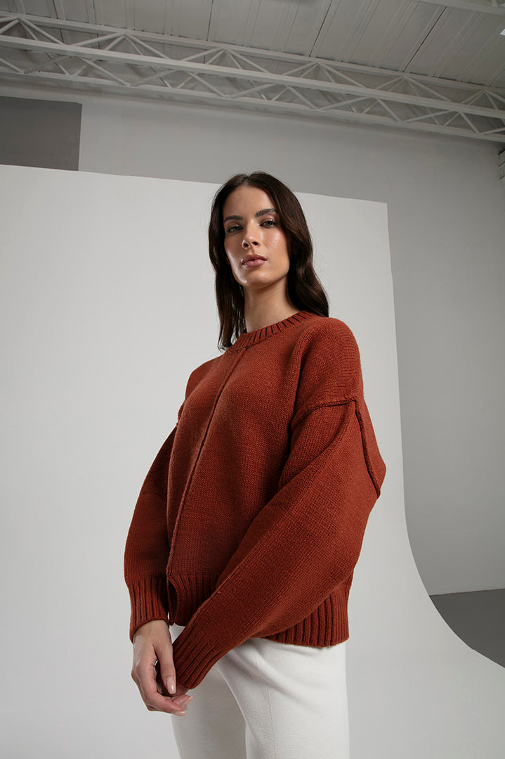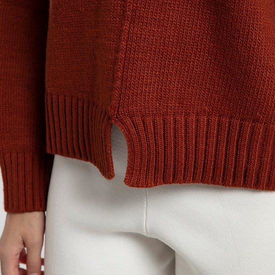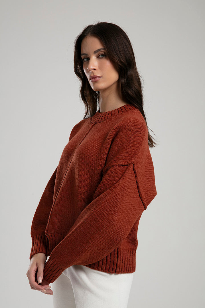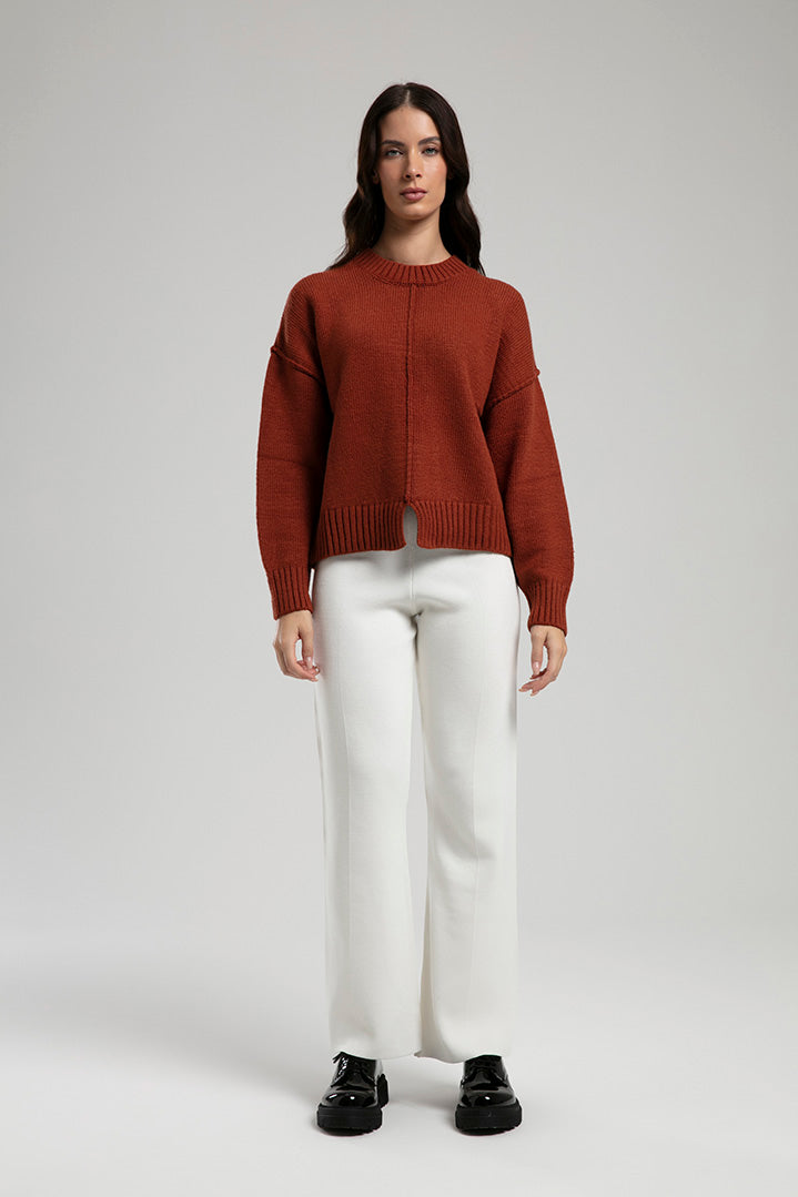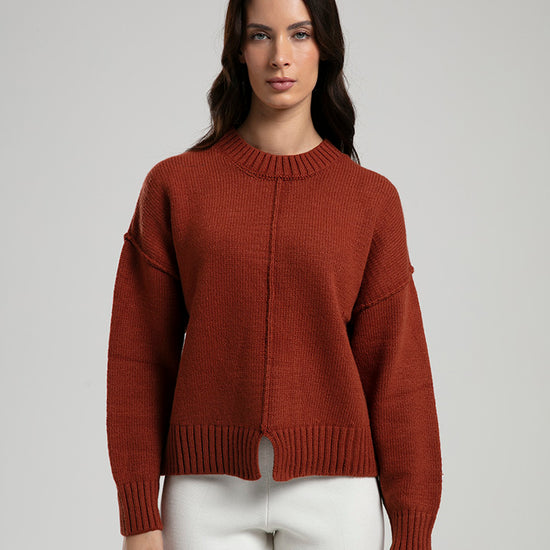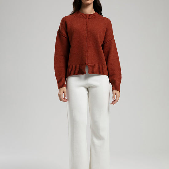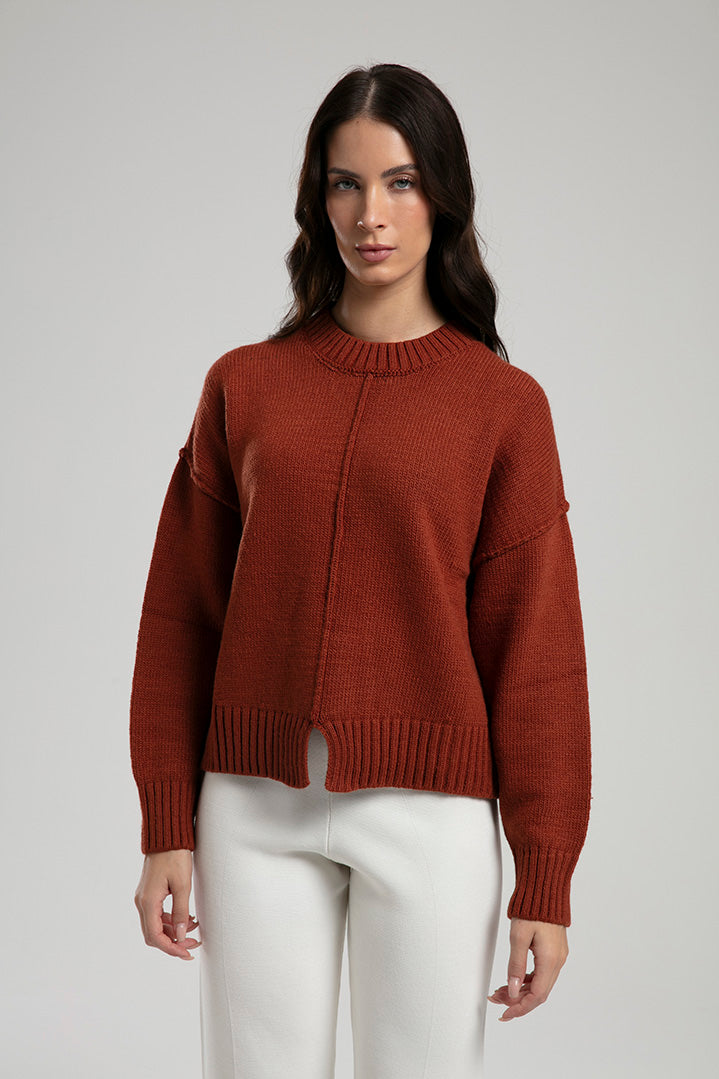 A wool sweater featuring a relaxed fit with dropped shoulders and ribbed detailing at the collar, cuffs, and hem. The central seam and subtle front slit add a modern touch to this classic knit. Perfect for layering with tailored trousers or denim, it brings effortless style and comfort to everyday looks.